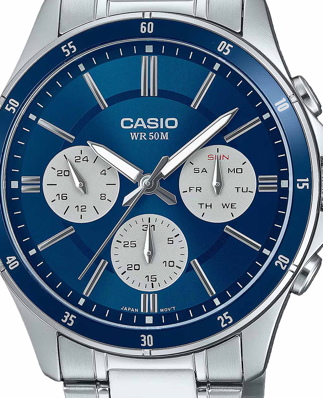 Японские мужские наручные часы с минеральным стекломМинеральное стеклоМинеральное стекло представляет собой искусственно выращенный минерал кварца. Такое стекло отличается особой устойчивостью к повреждениям и царапинам. Уступает по некоторым качествам сапфировому стеклу. Casio Collection MTP-1374D-2A3V, кварцевый механизм с высокой точностью. Класс водозащиты: 50 метров, позволит защитить корпус от случайных брызг или капель дождя. Корпус часов изготовлен из стали. Стальной браслет на раскладной застёжкеРаскладная застёжкаТакой тип застёжки используется только на браслетах из металла. Она никогда не раскрывается полностью, происходит разделение на 2 и более частей. Раскладывающая застёжка снизит вероятность потери часов к минимуму.. Стрелки с люминесцентным покрытиемЛюминесцентное покрытиеПозволяет считывать показания времени в темноте. Производители наносят на стрелки, часовые индексы, безель или поверхность циферблата светонакопительный состав, дающий холодное свечение.. 12-ти и 24-х часовой формат времени, число и день недели вынесены на отдельные циферблаты. Метки в виде штрихов. Заводная головка с защитой. БезельБезельВнешний ободок, закрепляющий стекло. В спортивных часах так называется поворотное кольцо с делениями на циферблате, выполняет роль таймера – замеряет отрезки времени на шкале. Неподвижный безель – элемент декора. Однонаправленно вращающийся безель на дайверских часах позволяет фиксировать моменты погружения и выныривания на поверхность. с IP-покрытиемIP-покрытиеМетод ионного напыления. Демонстрирует повышенную устойчивость к истиранию, окислению и химическим веществам. Под воздействием высокого давления и температуры около 1500°C молекулы металла надёжно соединяются с частицами корпуса часов..