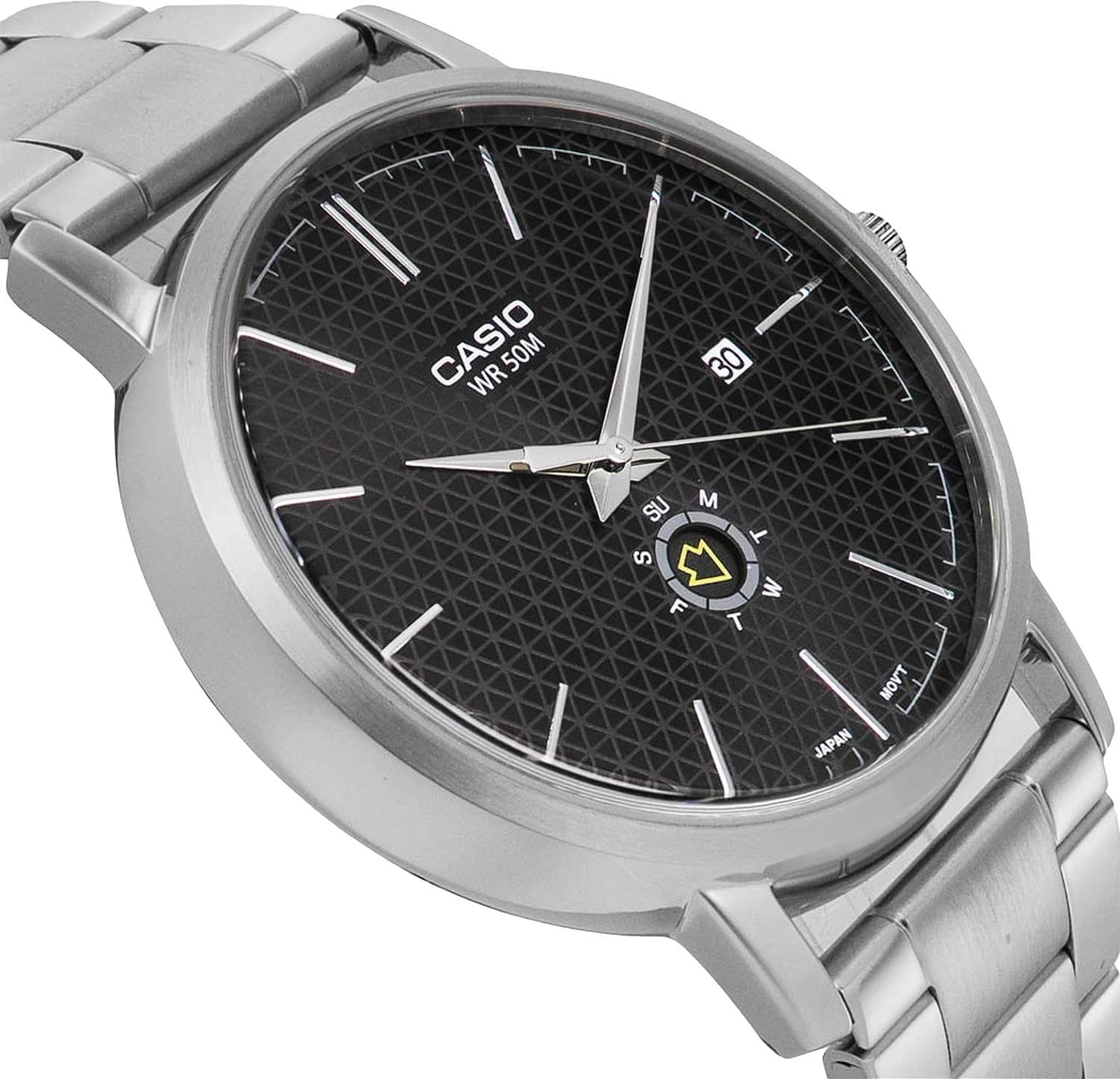 Японские мужские наручные часы Casio Collection MTP-B125D-1A, кварцевый механизм с высокой точностью. Отображение числа и дня недели. Класс водозащиты: 50 метров, позволит защитить корпус от случайных брызг или капель дождя. Корпус часов изготовлен из стали, серебристого цвета. Раскладная застёжкаРаскладная застёжкаТакой тип застёжки используется только на браслетах из металла. Она никогда не раскрывается полностью, происходит разделение на 2 и более частей. Раскладывающая застёжка снизит вероятность потери часов к минимуму..