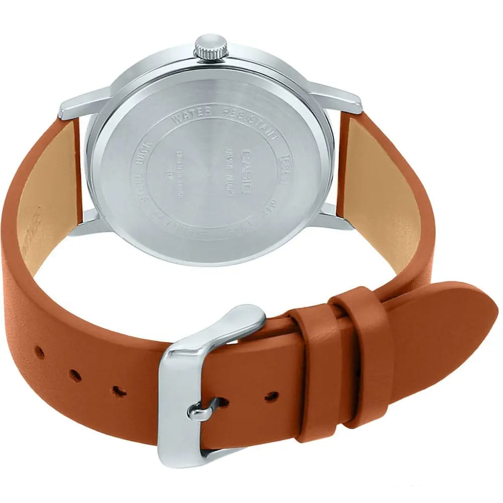 Японские мужские часы с минеральным стекломМинеральное стеклоМинеральное стекло представляет собой искусственно выращенный минерал кварца. Такое стекло отличается особой устойчивостью к повреждениям и царапинам. Уступает по некоторым качествам сапфировому стеклу. Casio Collection MTP-E145L-5B1, кварцевый механизм с высокой точностью. Класс водозащиты: 50 метров, позволит защитить корпус от случайных брызг или капель дождя. Корпус часов изготовлен из стали. Ремешок с классической застежкой.