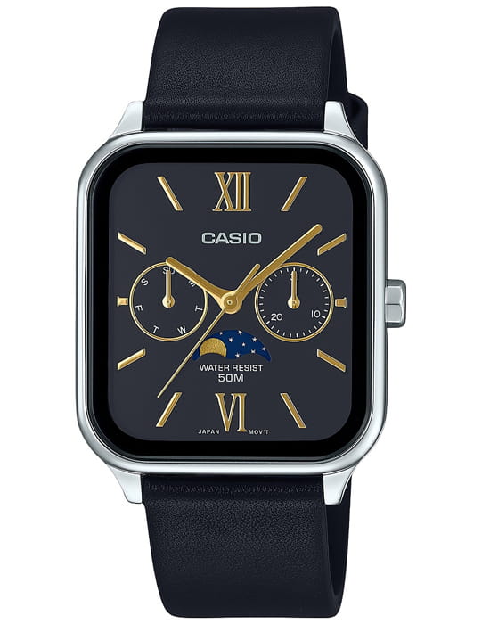 Японские мужские кварцевые часы с минеральным стекломМинеральное стеклоМинеральное стекло представляет собой искусственно выращенный минерал кварца. Такое стекло отличается особой устойчивостью к повреждениям и царапинам. Уступает по некоторым качествам сапфировому стеклу. Casio Collection MTP-M305L-1A2VDF (MTP-M305L-1A2), кварцевый механизм с высокой точностью. Корпус часов изготовлен из нержавеющей стали. Циферблат с метками в виде штрихов. Особенностью модели является наличие индикатора фазы луны над шестью часами по циферблату. Индикатор имеет 4 положения и отображается новолуние и полнолуние, а также растущую и убывающую Луну. Батарейка рассчитана на 3 года. Класс водозащиты: 50 метров, позволит защитить корпус от случайных брызг или капель дождя. Кожаный ремешок на стандартной застежке.