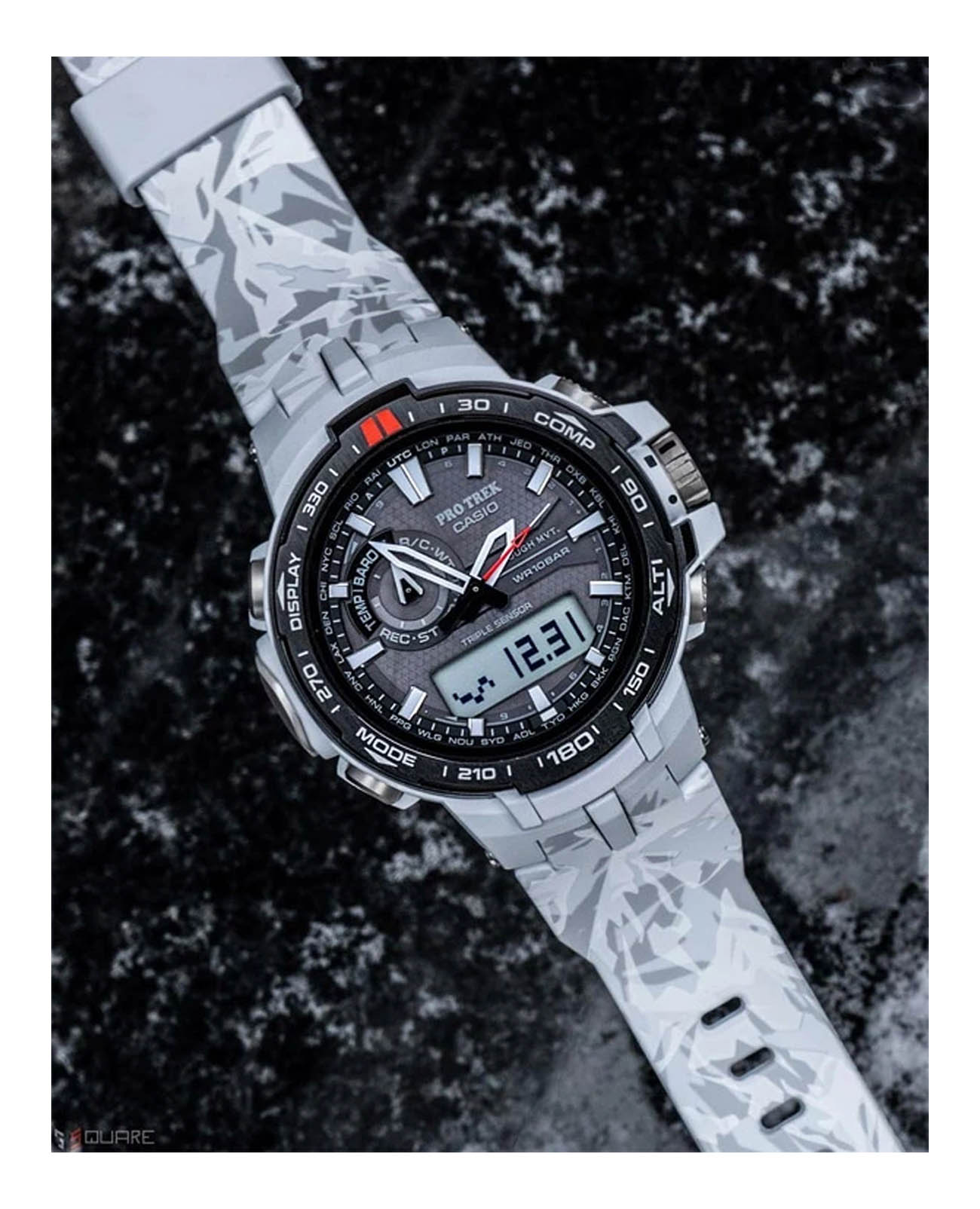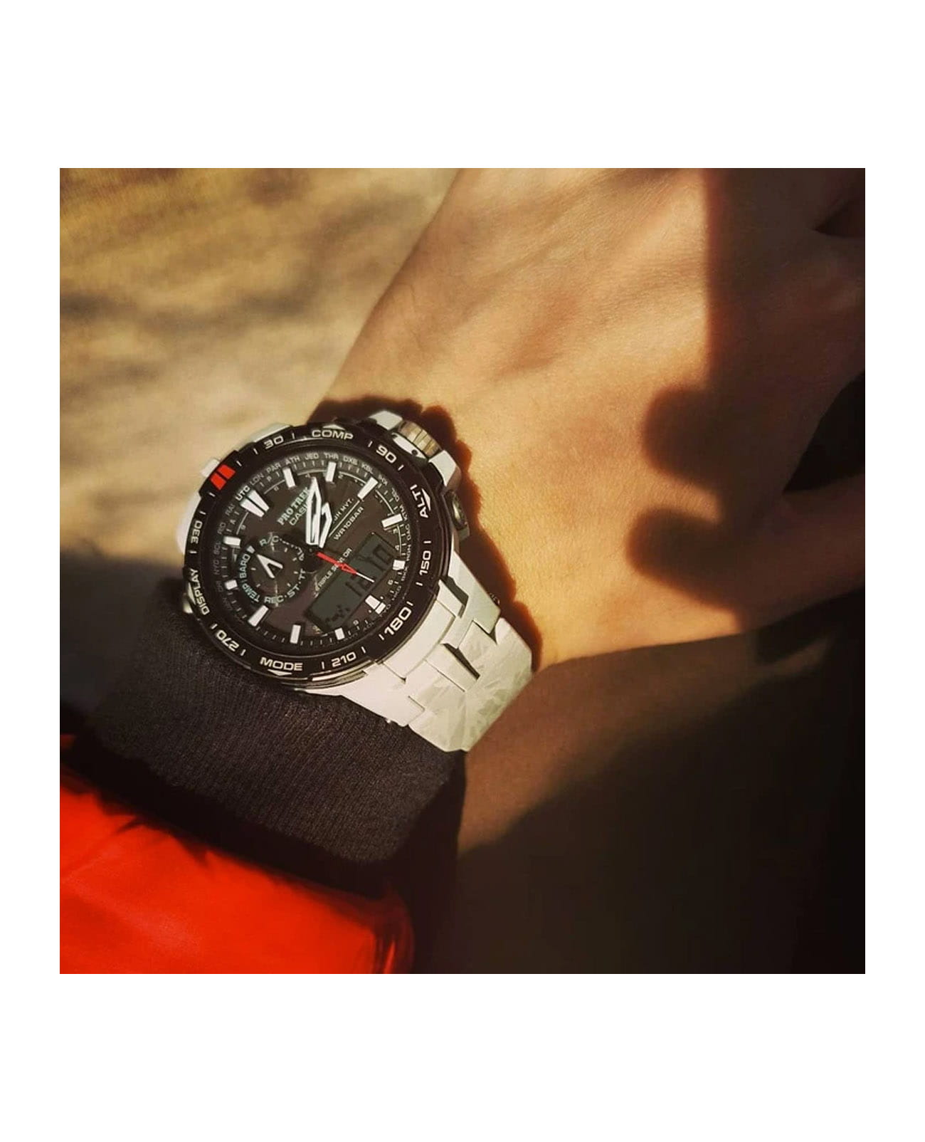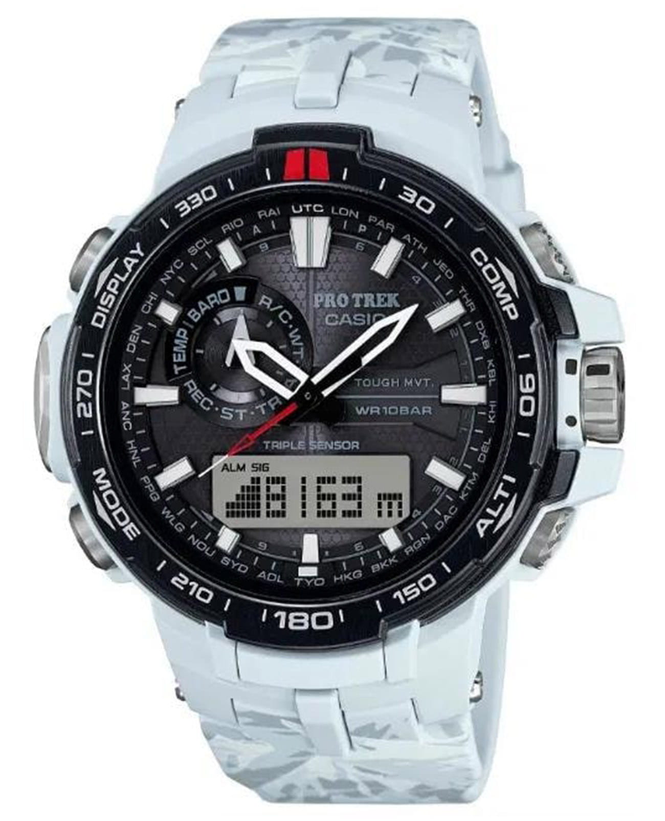 Японские мужские часы-хронографХронографФункция позволяет измерять отрезки времени с особой точностью: часы, минуты, секунды. Верным признаком хронографа является наличие на циферблате 3 дополнительных окошек-счётчиков. Casio Pro Trek PRW-6000SC-7. Минеральное стеклоМинеральное стеклоМинеральное стекло представляет собой искусственно выращенный минерал кварца. Такое стекло отличается особой устойчивостью к повреждениям и царапинам. Уступает по некоторым качествам сапфировому стеклу. устойчивое к появлению царапин, обладающее высокой прозрачностью. Pro Trek представляет новые камуфляжные вариации для многофункциональных и спортивных часов. Многофункциональные мужские часы для туризма. Питание от солнечной энергии Tough SolarTough SolarТехнология основана на подзарядке аккумулятора от источника солнечного света, специальная панель улавливает солнечные лучи и преобразует их в энергию для работы часов. Достаточно пары минут нахождения на солнце для функционирования часов в течении суток. - солнечные батарейки большой мощности, индикатор заряда батареи. Время работы аккумулятора без подзарядки приблизительно 6 месяцев, при включенной функции сохранения энергии приблизительно 23 месяца. Модуль часов рассчитан на работу при низких температурах до -10°С/14°F. Корпус часовы выполенен из пластика и стали с IP-покрытиемIP-покрытиеМетод ионного напыления. Демонстрирует повышенную устойчивость к истиранию, окислению и химическим веществам. Под воздействием высокого давления и температуры около 1500°C молекулы металла надёжно соединяются с частицами корпуса часов.. Циферблат подсвечивается ярким светодиодомСветодиодная подсветкаСветодиодная или LED-подсветка обеспечивает появление яркого холодного свечения за счёт LED-элементов - маленьких лампочек. Они потребляют минимальное количество энергии, чаще всего можно встретить 1 светодиод, в нижней части циферблата., при недостаточном освещении во время поворота запястья в сторону лица подсветка включается автоматически.  Мировое времяМировое время Полезное часовое усложнение, отображающее время в основных городах и известных областях по всему миру, оно связано с часовыми поясами, удобно для путешественников и бизнесменов. – 29 городов (29 часовых поясов), всемирное координированное время (UTC). Функция включения/отключения летнего времени. 12-ти и 24-х часовой формат времени. Переключение между домашним и мировым временем. Технология Multi Band 6 позволяет принимать сигналы от шести радиовышек, расположенных в различных точках земного шара, которые передают временные сигналы от определенных атомных часов.  Коррекция текущего времени радиосигналом на территории почти всей Европы, США, Японии и Китая. Термометр от -10° до +60°С с точностью 0,1°C. Барометр - измерение атмосферного давления от 260 до 1100 гПа (от 195 до 825 мм рт. ст.). Встроенный цифровой компас. Диапазон измерения от 0° до 359° с точностью 1°. Высотомер - встроенный датчик барометрического давления с возможностью вывода результатов в единицах высоты над уровнем моря (от -700 до 10000 метров). Хранение до 30 записей о высотных точках рельефа местности - измеренной абсолютной высоты, даты и времени. Функция отключения/включения звука и перемещения стрелок. Циферблат с метками в виде штрихов выполнен по технологии Sunray (солнечные лучи).  СекундомерСекундомерСеку