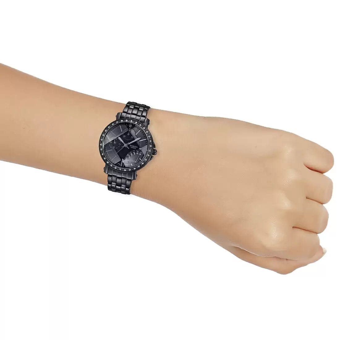 Стильные женские кварцевые часы. Корпус и браслет сделаны из нержавеющей стали с IP-покрытиемIP-покрытиеМетод ионного напыления. Демонстрирует повышенную устойчивость к истиранию, окислению и химическим веществам. Под воздействием высокого давления и температуры около 1500°C молекулы металла надёжно соединяются с частицами корпуса часов.. Безель и циферблат украшены кристаллами Swarovski. Часы оснащены тремя дополнительными циферблатами с 24-часовым временем, датой и днём недели. Стрелки с люминесцентным покрытиемЛюминесцентное покрытиеПозволяет считывать показания времени в темноте. Производители наносят на стрелки, часовые индексы, безель или поверхность циферблата светонакопительный состав, дающий холодное свечение..