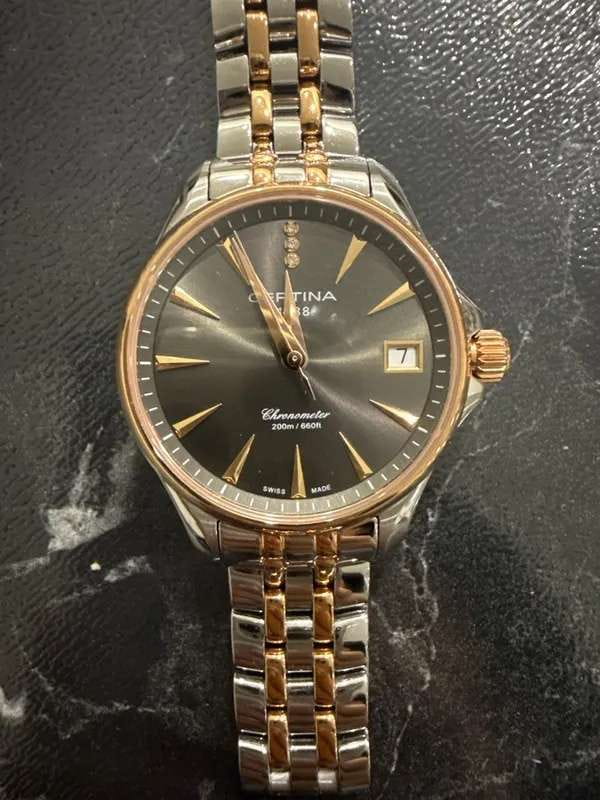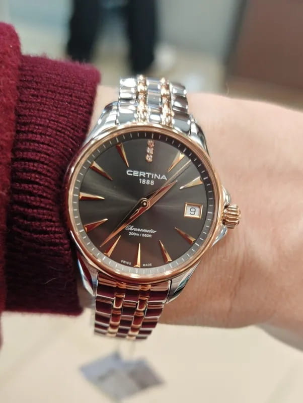 Аксессуар обладает изящным силуэтом, отражающим классический стиль и элегантность. Циферблат украшен 3 роскошными бриллиантами оттенка Top Wesselton. Часы комплектуются высокоточным кварцевым калибром F06.411 от швейцарской компании ETA, высокая точность механизма подтверждается сертификатом хронометра COSCСертификат COSCОфициальный сертификат, подтверждающий то, что часы ходят с особо высокой точностью. Для получения документа часы подвергаются тестовым испытаниям, разработанным швейцарским институтом тестирования хронометров COSC. Допустимая норма для механических часов -4/+6 секунд в день, для кварцевых моделей +/- 0,07 секунд в день.. Концепция DS ConceptDS ConceptDouble Security Concept, обозначает двойную надёжность и безупречную точность часов Certina. Двойная система защиты подразумевает обеспечение максимальной устойчивости к ударам и высоких показателей водонепроницаемости. гарантирует повышенную ударопрочность часов и сохранение водонепроницаемости до 20 бар. Одностороннее антибликовое покрытие сапфирового стекла.Корпус и браслет из хирургической стали 316L. PVD-покрытиеPVDУльтратонкое покрытие наносится в технике вакуумного напыления, сочетает в себе нитрид титана особой прочности со слоем золота или оксида хрома. Несёт в себе декоративную или защитную функцию. цвета розового золота. . Окошко даты, функция EOLEOLПредставляет собой систему, уведомляющую владельца часов о необходимости замены элемента питания. За 2 недели до полного разряда батарейки секундная стрелка перестаёт ходить чётко и начинает перепрыгивать на 3-4 деления.. Диаметр корпуса: 33,8 мм.