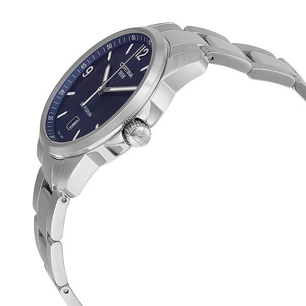 Наручные часы с синим циферблатом выполнены в спортивном стиле, серебристая расцветка останется актуальной на долгие годы. Модель сделана из нержавеющей стали 316L, материал отличается ударопрочностью и стойко защищает швейцарский кварцевый калибр ETA F06.111. Сапфировое стекло с антибликовой обработкой. Система DS ConceptDS ConceptDouble Security Concept, обозначает двойную надёжность и безупречную точность часов Certina. Двойная система защиты подразумевает обеспечение максимальной устойчивости к ударам и высоких показателей водонепроницаемости.. Стрелки и индексы с люминесцентным покрытиемЛюминесцентное покрытиеПозволяет считывать показания времени в темноте. Производители наносят на стрелки, часовые индексы, безель или поверхность циферблата светонакопительный состав, дающий холодное свечение.. Водостойкость WR 100. . Отображение текущей даты. Диаметр корпуса: 38 мм.