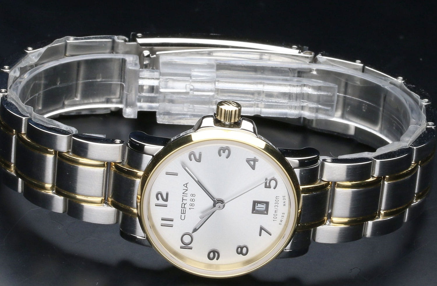 Женские швейцарские часы с сапфировым стеклом Certina DS Caimano C017.210.22.032.00, кварцевый механизм с высокой точностью. Сапфировое стеклоСапфировое стеклоПрочный и надёжный материал из кристалла сапфира синтетического происхождения, характеризующийся особой твёрдостью и устойчивостью к царапинам и повреждениям. устойчивое к появлению царапин, обладающее высокой прозрачностью. Циферблат выполнен по технологии Sunray (солнечные лучи). Узкие заостренные прямоугольные стрелки в стиле Baton с люминесцентным покрытием, которое светится в темноте после непродолжительной зарядки на свету. Метки в виде арабских цифр. Окошко даты находится в положении 6 часов. Класс водозащиты: 100 метров, позволит плавать, нырять и заниматься другими водными видами спорта. Корпус часов изготовлен из стали с PVDPVDУльтратонкое покрытие наносится в технике вакуумного напыления, сочетает в себе нитрид титана особой прочности со слоем золота или оксида хрома. Несёт в себе декоративную или защитную функцию. покрытием