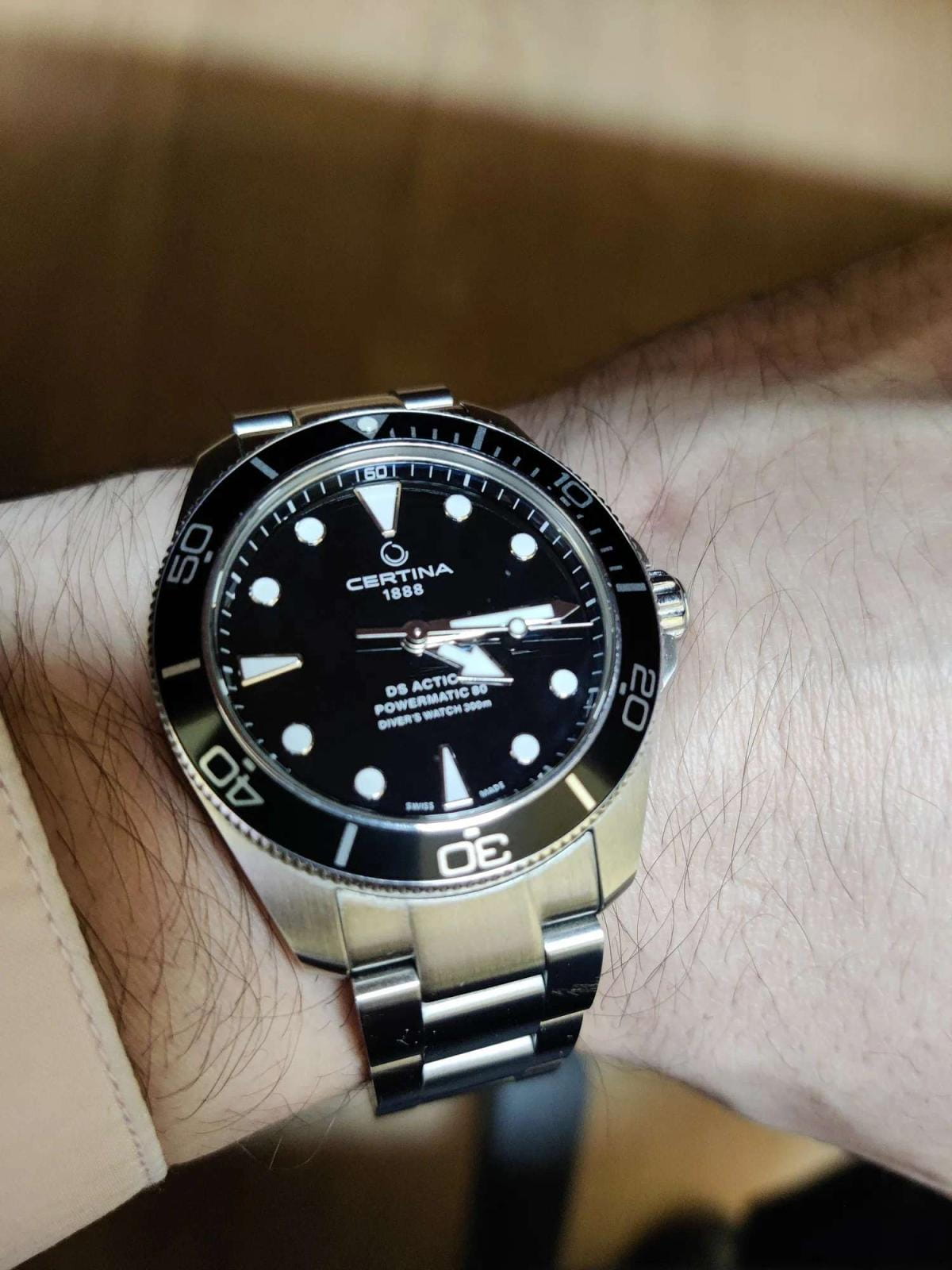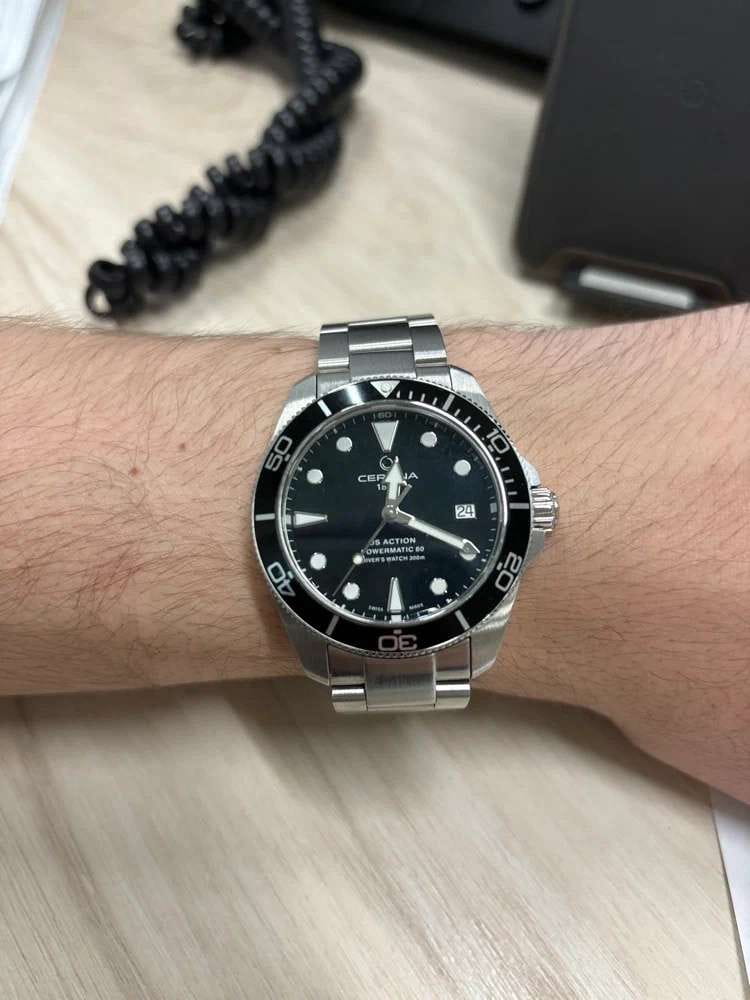 Отличные часы для повседневной носки. Компактный циферблат 38 мм и легкий вес (150 г) делают их очень удобными. Это настоящий сертифицированный дайвер (ISO 6425) с надежным полностью металлическим механизмом (серия 807), сапфировым стеклом и запасом хода 80 часов (снял в пятницу надел в понедельник). Точность хода отличная: мой экземпляр спешит всего на 1,5-2 секунды в сутки. Идеальный размер для запястья 18-22 см.