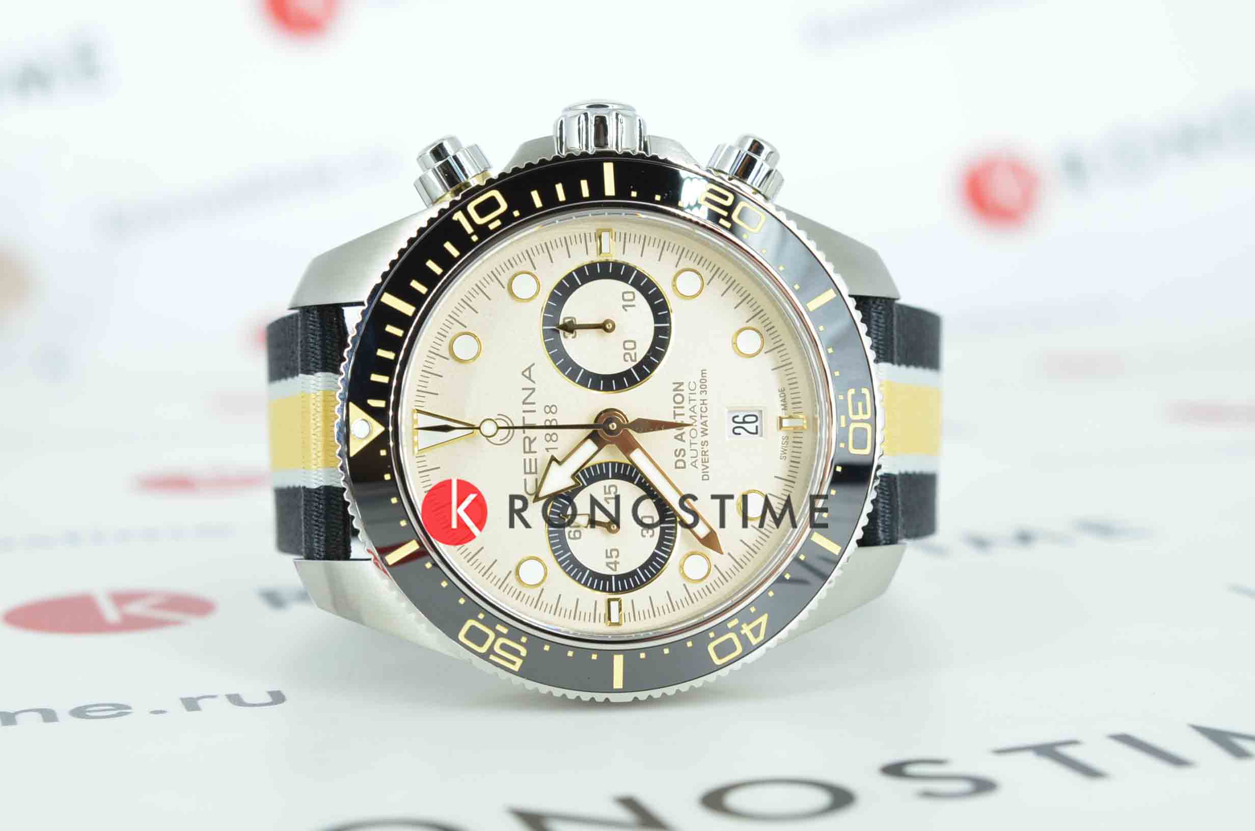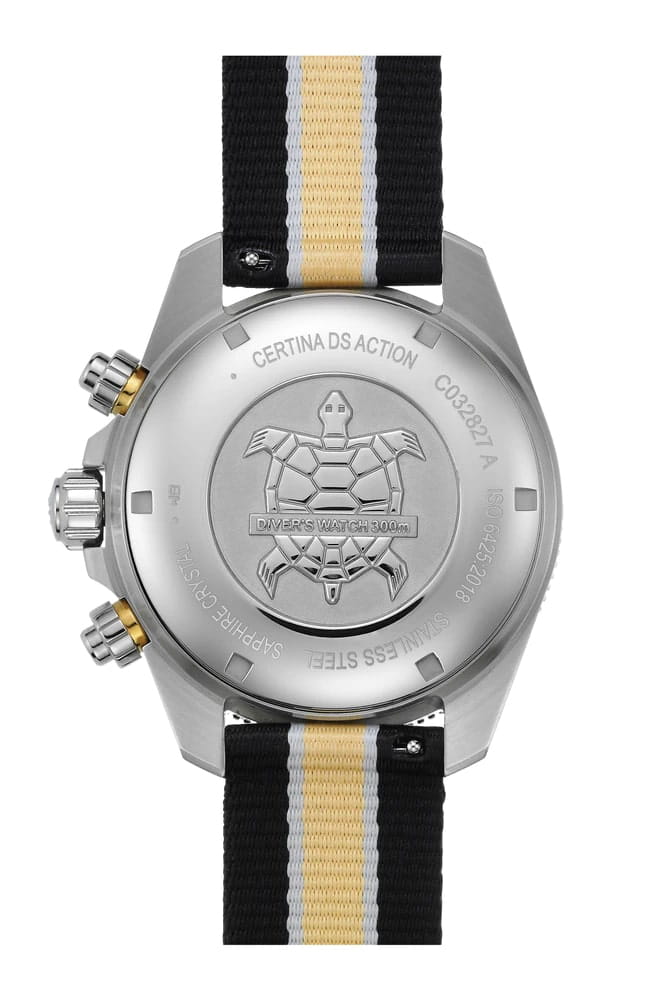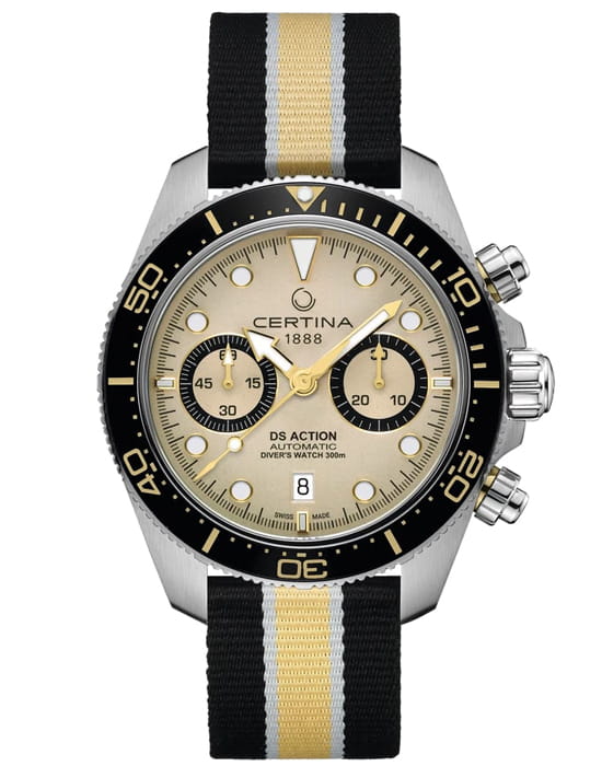 Коллекция DS Action открывает новые «глубины» часового искусства в прямом смысле этого слова: эти «морские» часы в стиле унисекс отличаются точностью, исключительной водостойкостью и динамичным дизайном – идеальный выбор для любой ситуации. Швейцарские мужские механические часы Certina DS Action Diver Chrono C032.827.18.271.00 из коллекции DS Action – безупречно точный и впечатляюще надёжный аксессуар. Габаритный хронографХронографФункция позволяет измерять отрезки времени с особой точностью: часы, минуты, секунды. Верным признаком хронографа является наличие на циферблате 3 дополнительных окошек-счётчиков. с бежевым циферблатом выгодно подчеркнёт повседневный или деловой образ. Модель соответствует стандарту ISO 6425 для дайверских часов и может похвастаться повышенной водостойкостью до 30 бар. Заводная головка, кнопки и задняя крышка завинчиваются для дополнительной герметичности. Аксессуар позволит вам чувствовать себя на высоте и в воде, и на суше. Сапфировое стеклоСапфировое стеклоПрочный и надёжный материал из кристалла сапфира синтетического происхождения, характеризующийся особой твёрдостью и устойчивостью к царапинам и повреждениям. с двухсторонней антибликовой обработкой. Керамический вращающийся безельБезельВнешний ободок, закрепляющий стекло. В спортивных часах так называется поворотное кольцо с делениями на циферблате, выполняет роль таймера – замеряет отрезки времени на шкале. Неподвижный безель – элемент декора. Однонаправленно вращающийся безель на дайверских часах позволяет фиксировать моменты погружения и выныривания на поверхность.. Корпус из нержавеющей стали 316L. Люминесцентная подсветкаЛюминесцентное покрытиеПозволяет считывать показания времени в темноте. Производители наносят на стрелки, часовые индексы, безель или поверхность циферблата светонакопительный состав, дающий холодное свечение.. Календарь, секундомер. Тканевый ремешок. Диаметр корпуса: 44,6 мм. Производство и сборка: Швейцария.