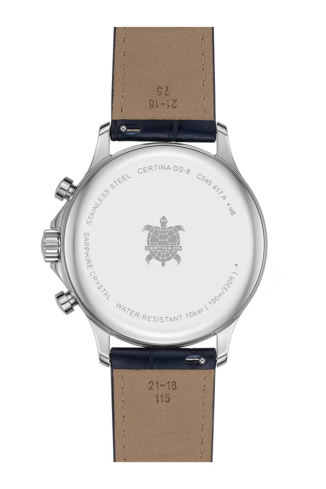Швейцарские мужские часы Certina DS-8 Chrono C045.417.16.041.00 выглядят стильно и гламурно, модель добавит изящества в повседневный образ. Кварцевый механизм с высокой точностью. Сапфировое стеклоСапфировое стеклоПрочный и надёжный материал из кристалла сапфира синтетического происхождения, характеризующийся особой твёрдостью и устойчивостью к царапинам и повреждениям. устойчивое к появлению царапин, обладающее высокой прозрачностью. Изысканный корпус часов диаметром 41 мм изготовлен из нержавеющей стали 316L. Синий циферблат с изысканными лаконичными стрелками и метками, а также с индикаторами хронографаХронографФункция позволяет измерять отрезки времени с особой точностью: часы, минуты, секунды. Верным признаком хронографа является наличие на циферблате 3 дополнительных окошек-счётчиков.. Стрелки с люминесцентным покрытиемЛюминесцентное покрытиеПозволяет считывать показания времени в темноте. Производители наносят на стрелки, часовые индексы, безель или поверхность циферблата светонакопительный состав, дающий холодное свечение. SuperLumiNova® обеспечивают превосходную читаемость даже в условиях низкой освещённости. Окошко даты находится в положении 4 часов. Класс водозащиты: 100 метров, позволит плавать, нырять и заниматься другими водными видами спорта. Изящный кожаный ремень со стандартной застежкой обеспечивает комфортную посадку на запястье. Коллекция DS-8 объединяет техническое совершенство с безупречно стильным исполнением.