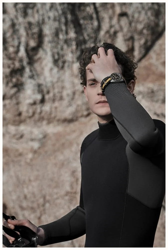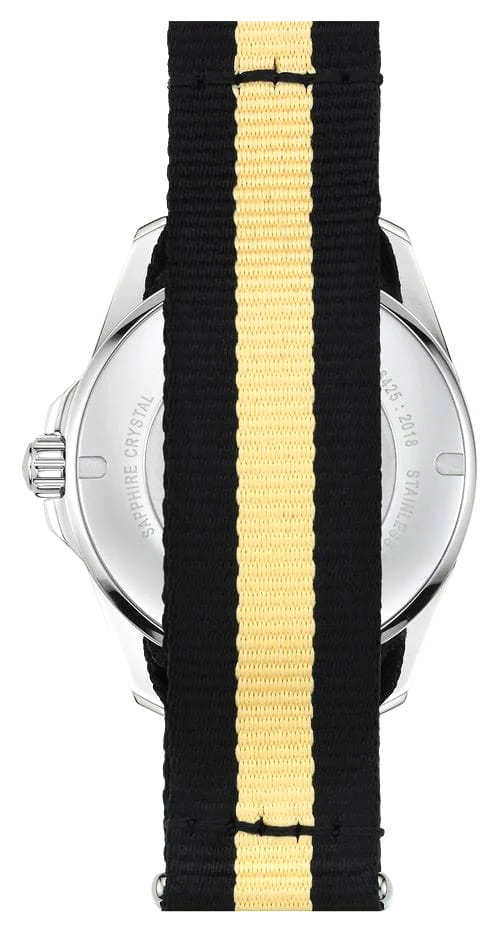 Мужские механические часы Certina DS-Action C0484071805101 — это надёжный аксессуар, созданный для тех, кто ценит сочетание швейцарского качества, функциональности и стиля. Модель входит в коллекцию Aqua, что подчёркивает её предназначение для водных активностей. Корпус диаметром 40,5 мм выполнен из нержавеющей стали с чёрной керамической рамкой, которая не только придаёт модели спортивный вид, но и защищает механизм от царапин. Циферблат чёрного цвета дополнен люминесцентными стрелками и индексами, обеспечивающими отличную читаемость даже в условиях слабого освещения. Защиту механизма обеспечивает сапфировое стеклоСапфировое стеклоПрочный и надёжный материал из кристалла сапфира синтетического происхождения, характеризующийся особой твёрдостью и устойчивостью к царапинам и повреждениям. с антибликовым покрытиемАнтибликовое покрытиеСлой оксида металла в 0,13-0,3 микрон, благодаря которому стекло часов не бликует и не отражает свет. Антибликовое покрытие уменьшает отражение света в 10 раз, обеспечивая отличную читаемость показателей циферблата., устойчивое к повреждениям. Часы оснащены автоматическим механизмом с запасом хода до 80 часов и пружиной баланса Nivachron™, что гарантирует высокую точность и долговечность. Функция отображения времени (часы, минуты, секунды) и даты делает модель удобной для повседневного использования. Водонепроницаемость позволяет использовать часы на глубине до 300 метров — идеально для плавания и ныряния. Ремешок NATO чёрного и золотистого цвета застёгивается на булавку, обеспечивая комфорт и надёжную фиксацию на запястье. Концепция DS, лежащая в основе всех моделей бренда, обеспечивает двойную защиту от ударов и вибраций, а также повышенную устойчивость к внешним воздействиям. Эти часы станут универсальным аксессуаром для тех, кто ценит сочетание стиля, функциональности и надёжности — идеальный выбор для повседневной носки и активного образа жизни.