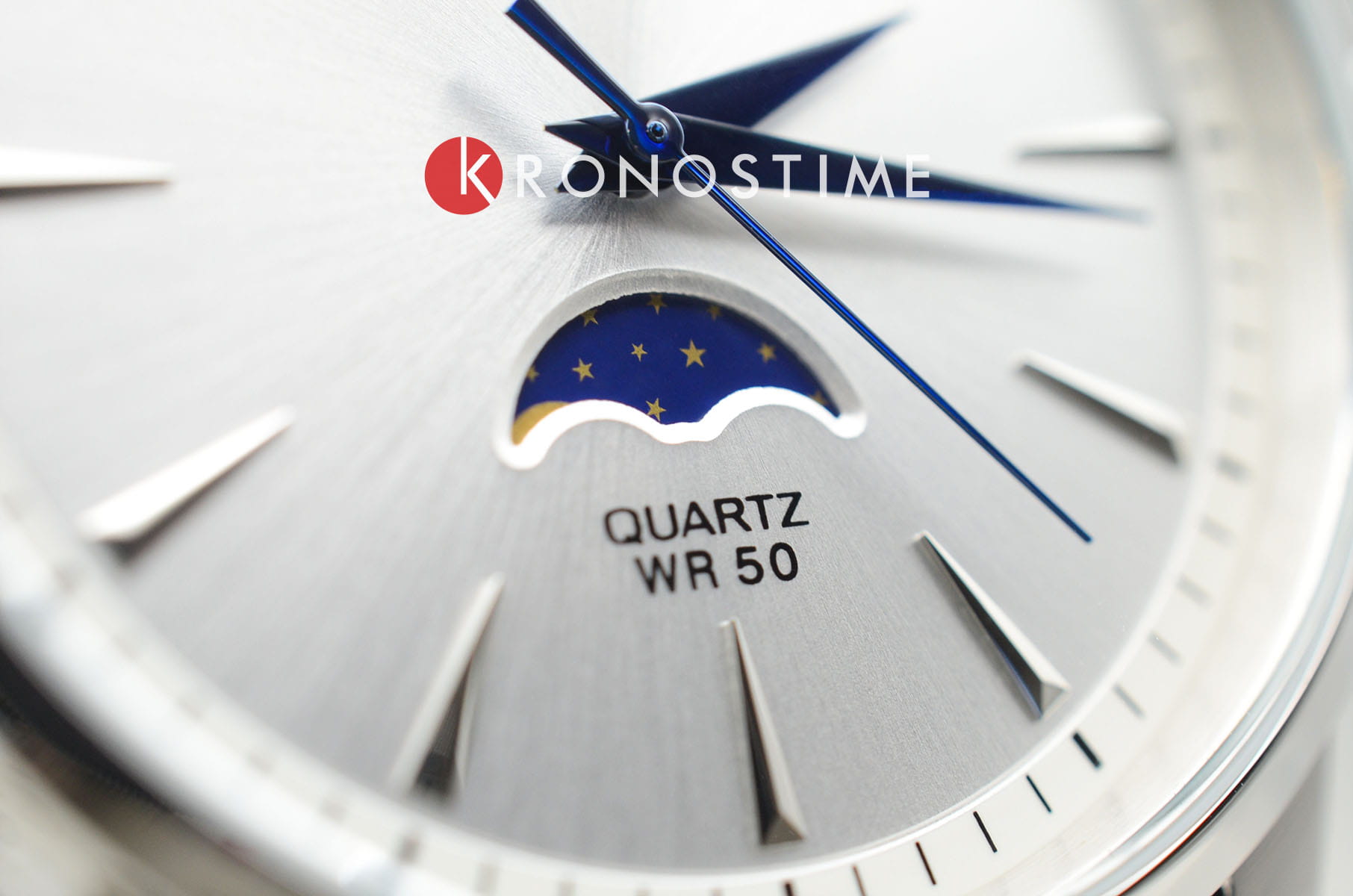 Часы Citizen AK5000-03A произведены в Японии и оснащены надёжным кварцевым механизмом калибра Citizen 6324. Корпус выполнен из нержавеющей стали и имеет классическую круглую форму диаметром 42 мм. Минеральное стеклоМинеральное стеклоМинеральное стекло представляет собой искусственно выращенный минерал кварца. Такое стекло отличается особой устойчивостью к повреждениям и царапинам. Уступает по некоторым качествам сапфировому стеклу. защищает серебристый циферблат, украшенный эффектом солнечных лучей по технологии Sunray. На циферблате расположены клиновидные стрелки в стиле Dauphine, метки в виде штрихов и римская цифра в положении 12 часов, а также индикатор фазы Луны — одно из самых востребованных усложнений в часовой классике. Часы защищены от воды по стандарту 50WR, что позволяет не бояться случайных брызг и дождя. Заводная головка отличается рифлёной поверхностью для удобства использования. Модель комплектуется синим кожаным ремешком с тиснением под кожу аллигатора и классической застёжкой. В качестве элемента питания используется батарейка SR621SW, обеспечивающая автономную работу до двух лет.