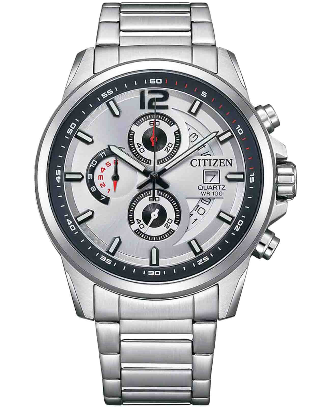 Citizen Chronograph AN3690-56A часы-хронографХронографФункция позволяет измерять отрезки времени с особой точностью: часы, минуты, секунды. Верным признаком хронографа является наличие на циферблате 3 дополнительных окошек-счётчиков. с секундомеромСекундомерСекундоме́р — прибор, способный измерять интервалы времени с точностью до долей секунды. спортивного дизайна с высоким уровнем водозащиты. Корпус из нержавеющей стали диаметром 44 мм идеально сбалансирован. Минеральное стеклоМинеральное стеклоМинеральное стекло представляет собой искусственно выращенный минерал кварца. Такое стекло отличается особой устойчивостью к повреждениям и царапинам. Уступает по некоторым качествам сапфировому стеклу. обеспечивает отличную защиту циферблата от царапин. Часы работают на основе кварцевого механизма. Стальной браслет на раскладной застёжкеРаскладная застёжкаТакой тип застёжки используется только на браслетах из металла. Она никогда не раскрывается полностью, происходит разделение на 2 и более частей. Раскладывающая застёжка снизит вероятность потери часов к минимуму. идеально дополняют дизайн часов, обеспечивая комфортное ношение. Секундомер с точностью 1с и временем измерения 12ч отображается центральной стрелкой. Циферблат с метками в виде штрихов выполнен по технологии Sunray (солнечные лучи). Окошко даты находится в положении 3 часа. Заводная головка с защитой. Часы обладают впечатляющей водонепроницаемостью до 100WR, что делает их идеальными для повседневной носки.