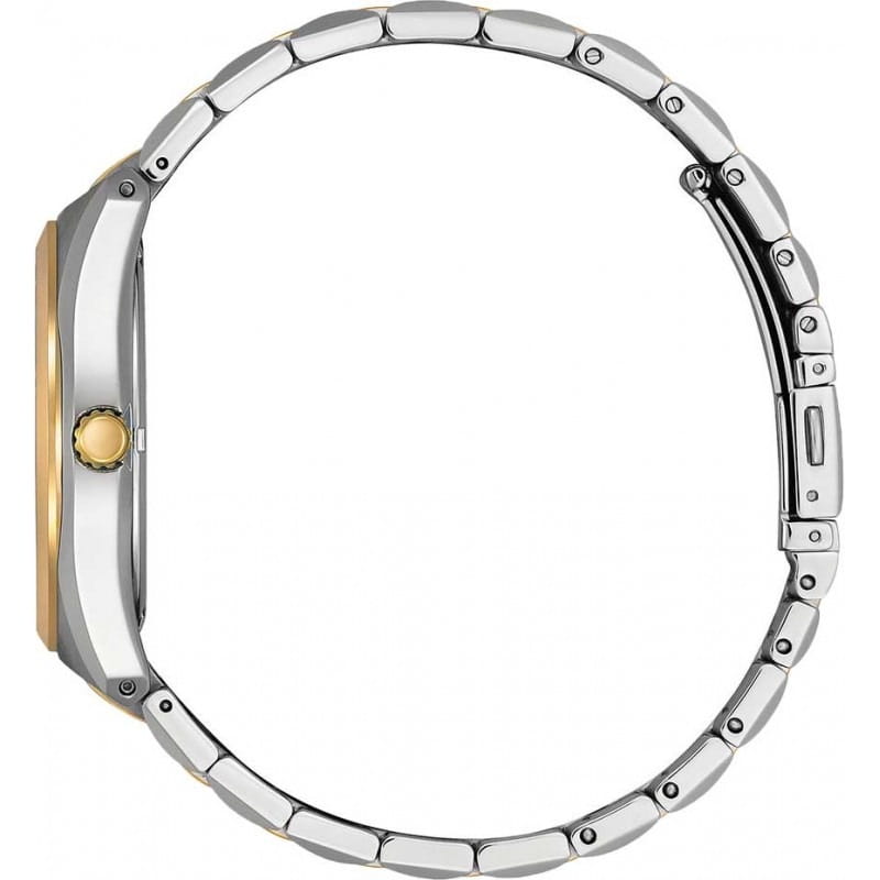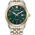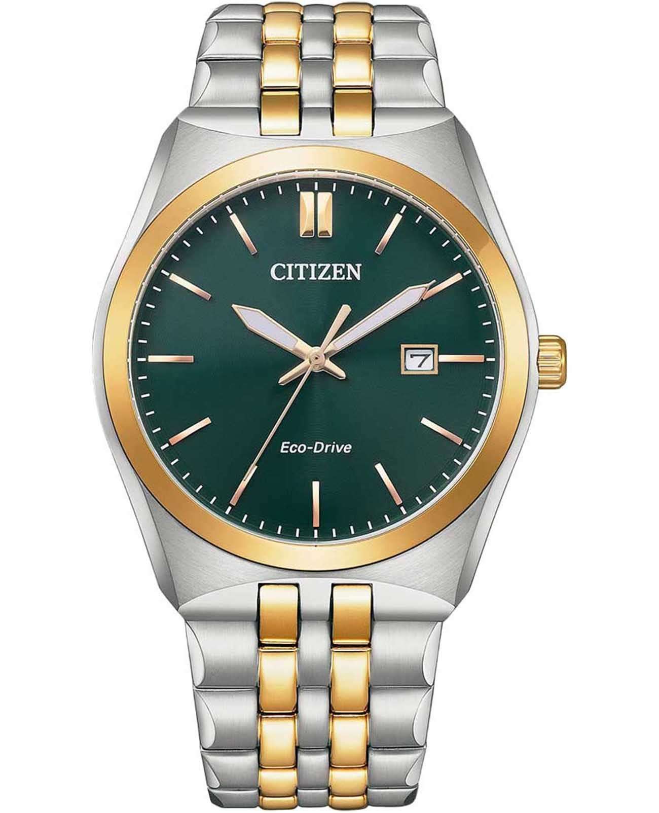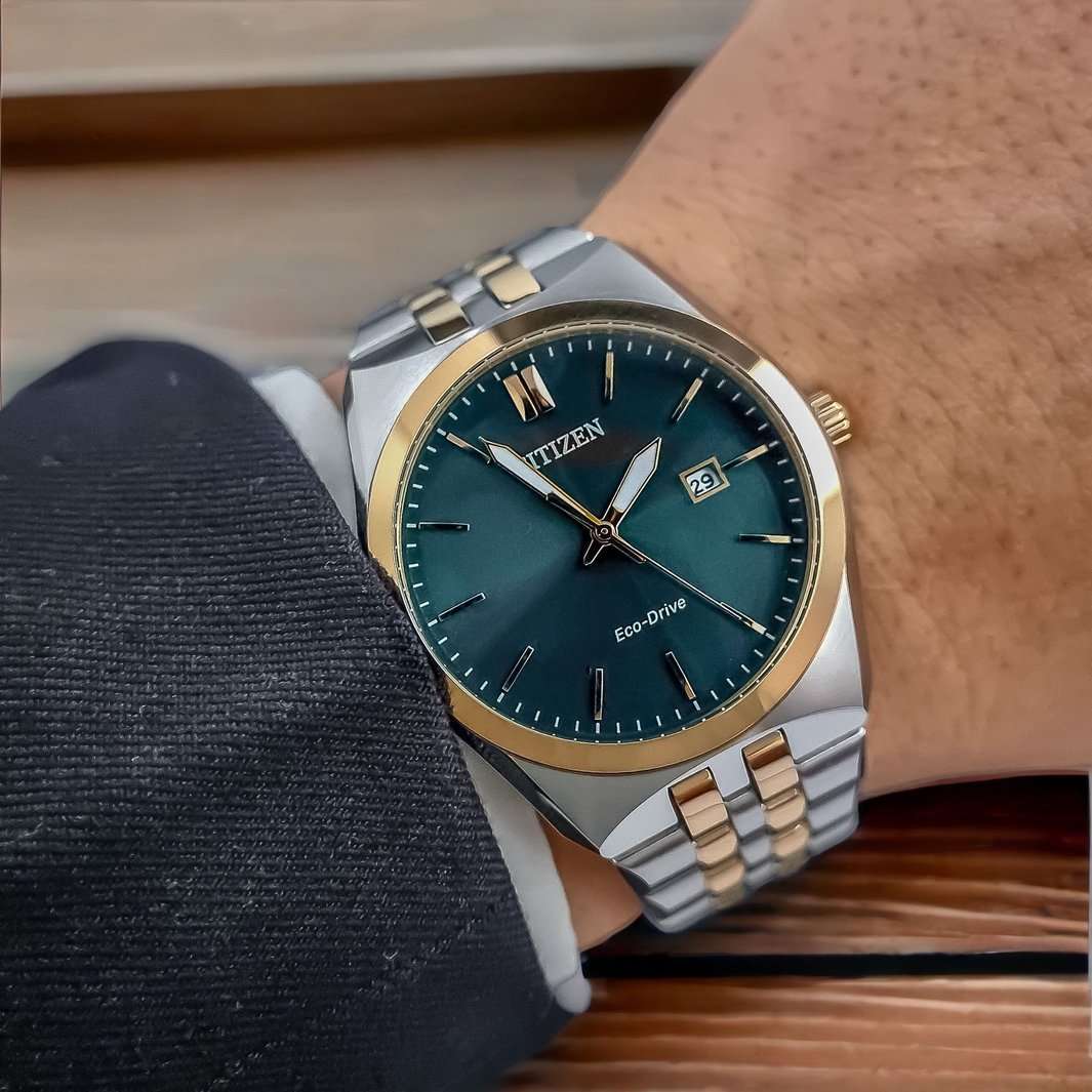 Citizen BM7339-89X — стильные японские часы, сочетающие классический дизайн и современные технологии. Корпус и браслет выполнены из прочной нержавеющей стали, а на безельБезельВнешний ободок, закрепляющий стекло. В спортивных часах так называется поворотное кольцо с делениями на циферблате, выполняет роль таймера – замеряет отрезки времени на шкале. Неподвижный безель – элемент декора. Однонаправленно вращающийся безель на дайверских часах позволяет фиксировать моменты погружения и выныривания на поверхность. с браслетом частично нанесено золотистое IP-покрытиеIP-покрытиеМетод ионного напыления. Демонстрирует повышенную устойчивость к истиранию, окислению и химическим веществам. Под воздействием высокого давления и температуры около 1500°C молекулы металла надёжно соединяются с частицами корпуса часов., что придает модели элегантный внешний вид и дополнительную износостойкость. Зеленый циферблат украшен аккуратными штриховыми метками, а окошко даты расположено на отметке 3 часа. Часы оснащены кварцевым механизмом Citizen E111 с фирменной системой Eco-Drive, благодаря которой питание осуществляется от солнечной энергии и не требуется регулярная замена батарейки. Запас хода составляет до 180 дней, предусмотрены функции индикации окончания заряда EOLEOLПредставляет собой систему, уведомляющую владельца часов о необходимости замены элемента питания. За 2 недели до полного разряда батарейки секундная стрелка перестаёт ходить чётко и начинает перепрыгивать на 3-4 деления. и предотвращения перезарядки аккумулятора. Минеральное стеклоМинеральное стеклоМинеральное стекло представляет собой искусственно выращенный минерал кварца. Такое стекло отличается особой устойчивостью к повреждениям и царапинам. Уступает по некоторым качествам сапфировому стеклу. надежно защищает циферблат от повреждений, а водозащита 100WR позволяет не снимать часы во время плавания и занятий водными видами спорта. Стрелки с люминесцентным покрытиемЛюминесцентное покрытиеПозволяет считывать показания времени в темноте. Производители наносят на стрелки, часовые индексы, безель или поверхность циферблата светонакопительный состав, дающий холодное свечение. обеспечивают отличную читаемость времени даже в темное время суток. Браслет снабжен удобной раскладной застёжкойРаскладная застёжкаТакой тип застёжки используется только на браслетах из металла. Она никогда не раскрывается полностью, происходит разделение на 2 и более частей. Раскладывающая застёжка снизит вероятность потери часов к минимуму., обеспечивая комфортную посадку на запястье. Диаметр корпуса составляет 40 мм, толщина — 9,2 мм, вес — 139 г. Эта модель станет отличным выбором для тех, кто ценит надежность, функциональность и безупречный стиль.