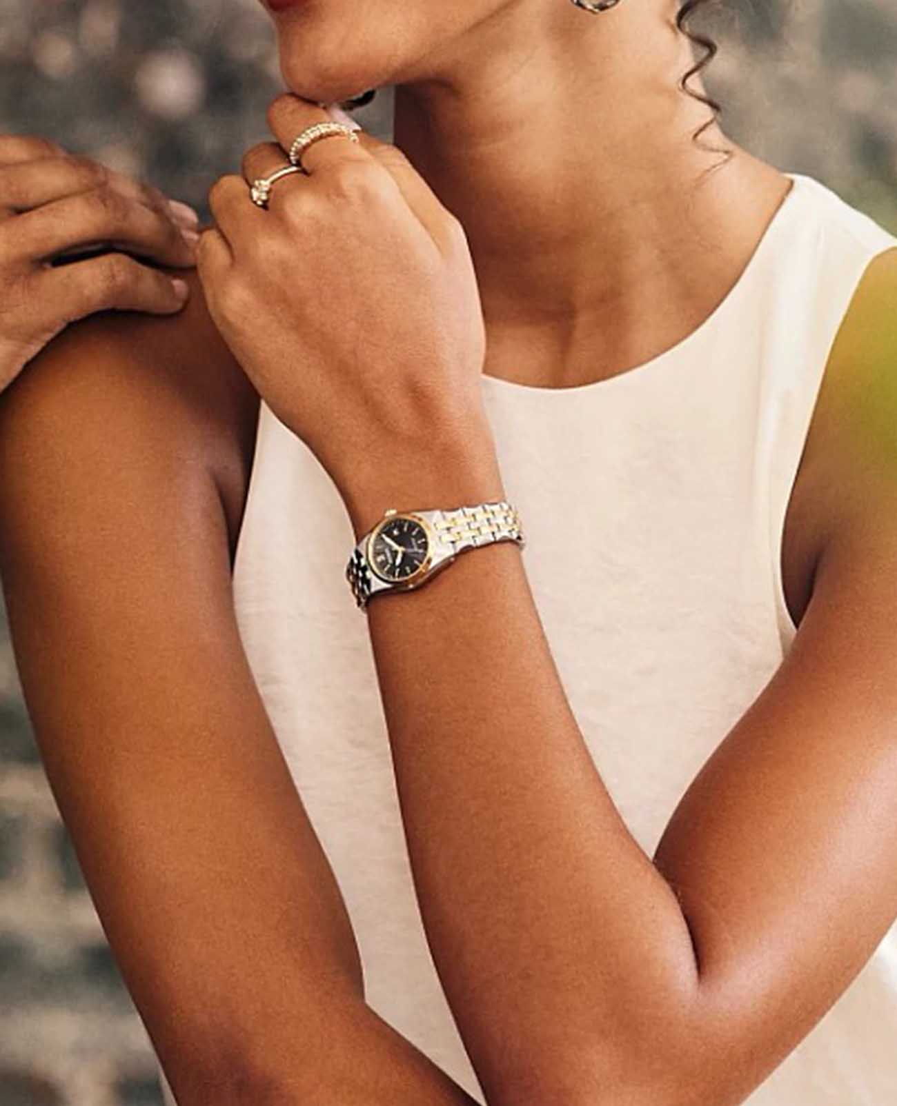 Часы Citizen EW2299-50E объединяют в себе современные технологии и изысканный дизайн. Надежный японский кварцевый механизм с инновационной системой Eco-Drive позволяет часам работать без замены батарейки, используя энергию света и обеспечивая запас хода до 180 дней. Модель оснащена функциями индикации заряда и предотвращения перезарядки, что делает эксплуатацию максимально удобной и безопасной. Корпус диаметром 27 мм выполнен из нержавеющей стали, а безельБезельВнешний ободок, закрепляющий стекло. В спортивных часах так называется поворотное кольцо с делениями на циферблате, выполняет роль таймера – замеряет отрезки времени на шкале. Неподвижный безель – элемент декора. Однонаправленно вращающийся безель на дайверских часах позволяет фиксировать моменты погружения и выныривания на поверхность. и браслет (частично) с золотистым IP-покрытиемIP-покрытиеМетод ионного напыления. Демонстрирует повышенную устойчивость к истиранию, окислению и химическим веществам. Под воздействием высокого давления и температуры около 1500°C молекулы металла надёжно соединяются с частицами корпуса часов., придающим изделию дополнительную прочность и стильный внешний вид. Сапфировое стеклоСапфировое стеклоПрочный и надёжный материал из кристалла сапфира синтетического происхождения, характеризующийся особой твёрдостью и устойчивостью к царапинам и повреждениям. устойчиво к царапинам и надолго сохраняет прозрачность. Браслет с раскладной застёжкойРаскладная застёжкаТакой тип застёжки используется только на браслетах из металла. Она никогда не раскрывается полностью, происходит разделение на 2 и более частей. Раскладывающая застёжка снизит вероятность потери часов к минимуму. гармонично завершает образ часов. Водозащита уровня WR 100 позволяет не снимать часы во время плавания и занятий сноркелингом. Циферблат украшен аккуратными часовыми индексами в виде штрихов дополнен окошком даты и стрелками с люминесцентным покрытиемЛюминесцентное покрытиеПозволяет считывать показания времени в темноте. Производители наносят на стрелки, часовые индексы, безель или поверхность циферблата светонакопительный состав, дающий холодное свечение.. Часы созданы и собраны в Японии, что гарантирует высокое качество и надежность.