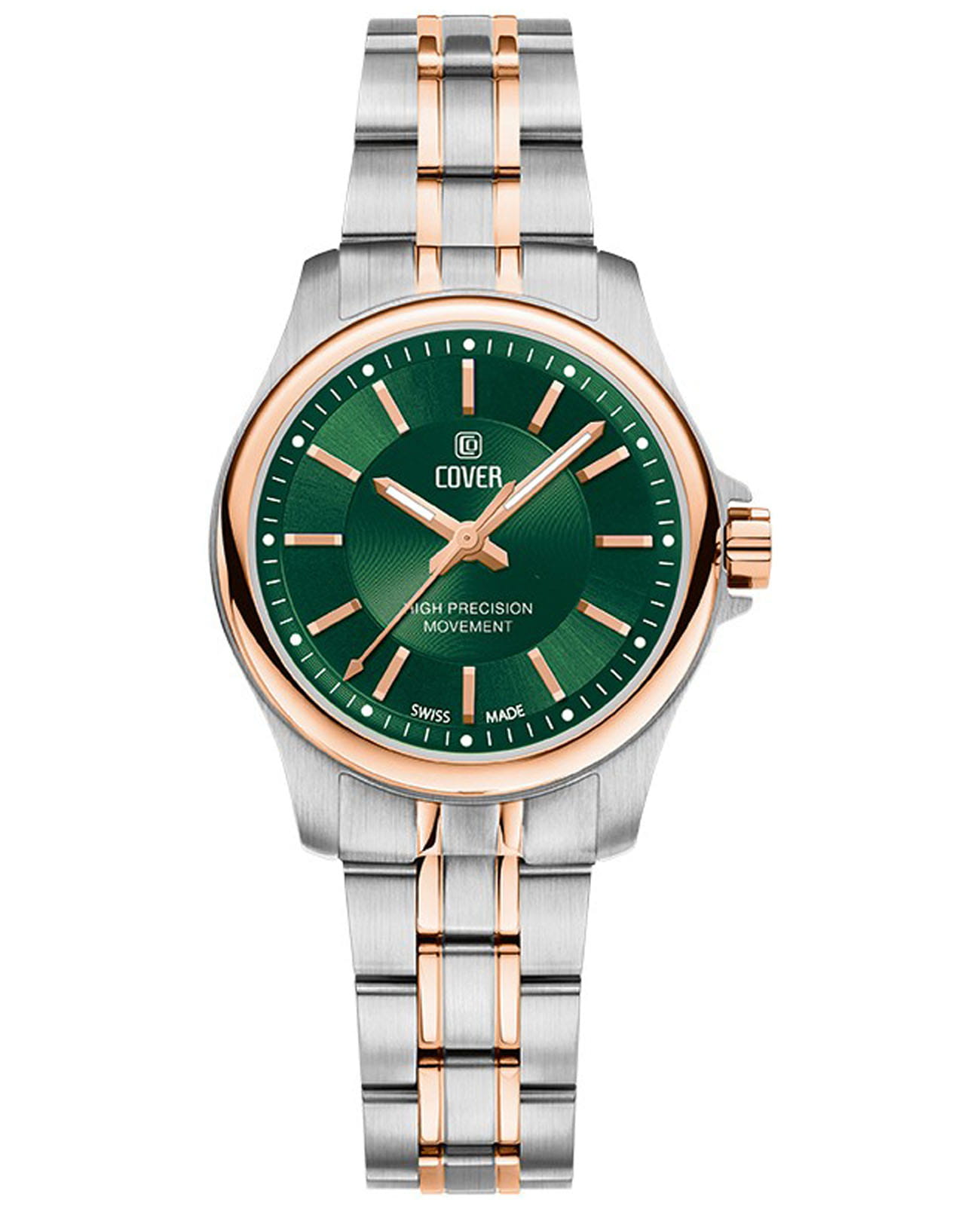 Женские наручные часы Cover CO201.33 из коллекции Marville сочетают в себе классический дизайн и высокую точность швейцарского производства. Модель обладает круглым корпусом диаметром 28 мм, изготовленным из нержавеющей стали, что придает изделию благородный внешний вид. Зеленый циферблат оснащен стрелками с люминесцентным покрытиемЛюминесцентное покрытиеПозволяет считывать показания времени в темноте. Производители наносят на стрелки, часовые индексы, безель или поверхность циферблата светонакопительный состав, дающий холодное свечение.. Для защиты используется сапфировое стеклоСапфировое стеклоПрочный и надёжный материал из кристалла сапфира синтетического происхождения, характеризующийся особой твёрдостью и устойчивостью к царапинам и повреждениям. с антибликовым покрытиемАнтибликовое покрытиеСлой оксида металла в 0,13-0,3 микрон, благодаря которому стекло часов не бликует и не отражает свет. Антибликовое покрытие уменьшает отражение света в 10 раз, обеспечивая отличную читаемость показателей циферблата., обеспечивающее прочную защиту от царапин и превосходную читаемость времени даже при ярком свете. БезельБезельВнешний ободок, закрепляющий стекло. В спортивных часах так называется поворотное кольцо с делениями на циферблате, выполняет роль таймера – замеряет отрезки времени на шкале. Неподвижный безель – элемент декора. Однонаправленно вращающийся безель на дайверских часах позволяет фиксировать моменты погружения и выныривания на поверхность. с PVD-покрытиемPVDУльтратонкое покрытие наносится в технике вакуумного напыления, сочетает в себе нитрид титана особой прочности со слоем золота или оксида хрома. Несёт в себе декоративную или защитную функцию. цвета розового золота. Часы работают на высокоточном кварцевом механизме ETA, гарантирующем исключительную точность хода с погрешностью около 20 секунд в месяц. Браслет выполнен из нержавеющей стали с частичным PVD-покрытиемPVDУльтратонкое покрытие наносится в технике вакуумного напыления, сочетает в себе нитрид титана особой прочности со слоем золота или оксида хрома. Несёт в себе декоративную или защитную функцию. и оснащен раскладной застежкойРаскладная застёжкаТакой тип застёжки используется только на браслетах из металла. Она никогда не раскрывается полностью, происходит разделение на 2 и более частей. Раскладывающая застёжка снизит вероятность потери часов к минимуму., обеспечивающей комфортное ношение и безопасность. Водонепроницаемость достигает 10 атмосфер (100 метров), что позволяет использовать их во время плавания и других водных видов спорта, однако не рекомендуется для глубоководного дайвинга. Эти швейцарские часы станут идеальным дополнением как классического, так и современного образа.