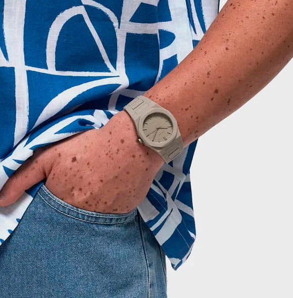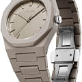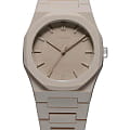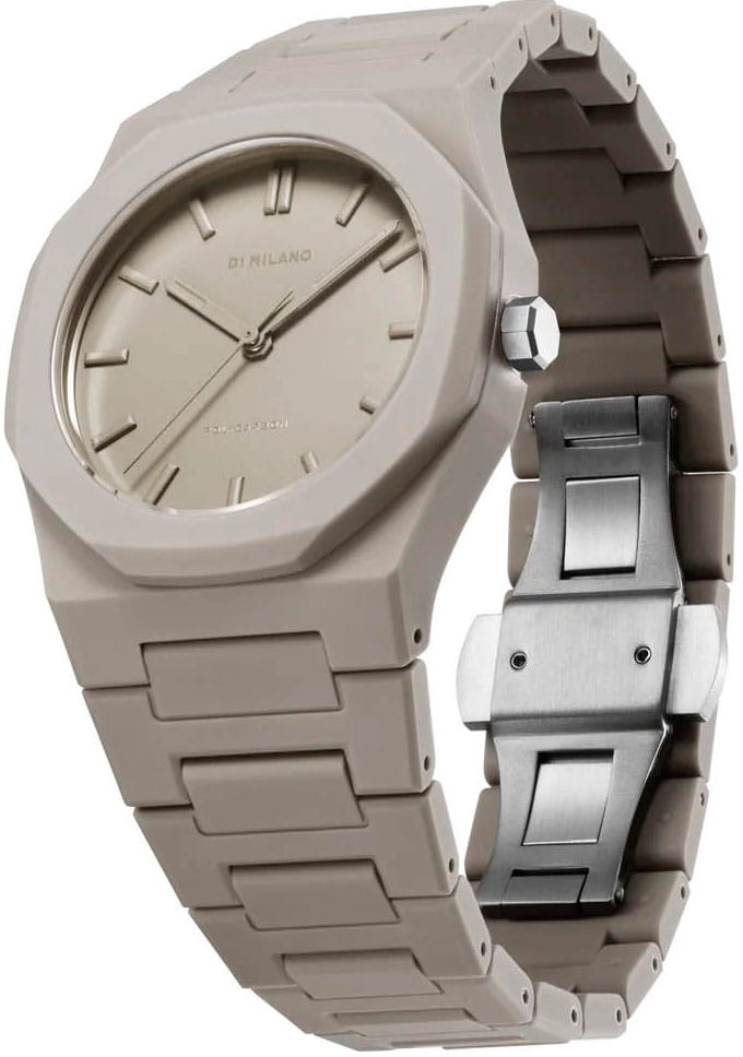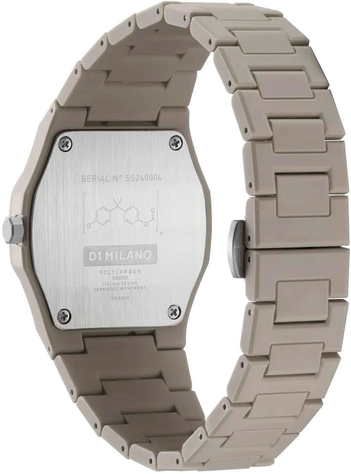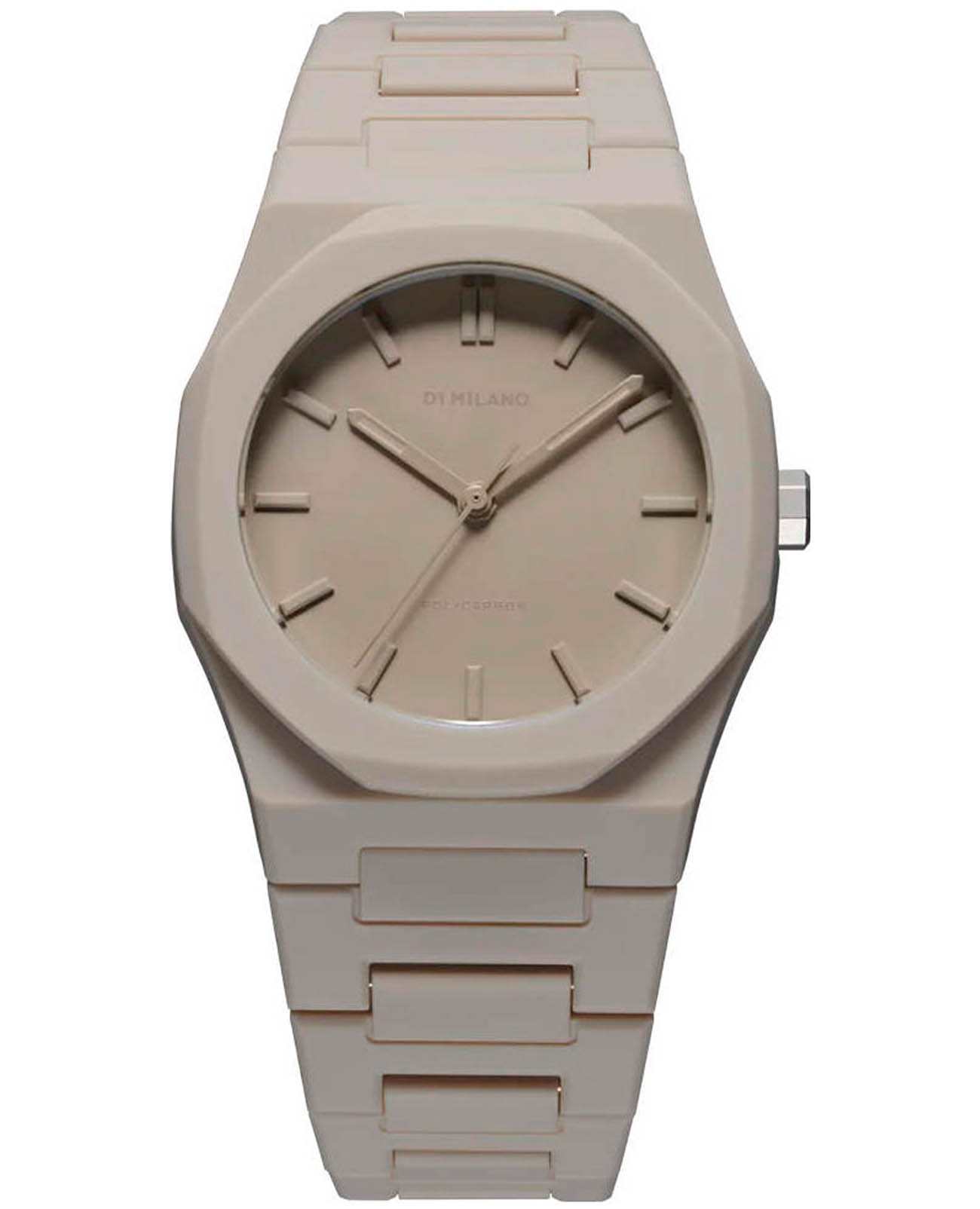 Часы D1 Milano Polycarbon PCBU06– молодежные часы в стиле унисекс для повседневных образов, стильные и комфортные.  Модель Ecru имеет бежевый корпус и браслет из поликарбоната с покрытием Софт-Тач. Циферблат лаконичный с индексами в виде штрихов, защищен минеральным стекломМинеральное стеклоМинеральное стекло представляет собой искусственно выращенный минерал кварца. Такое стекло отличается особой устойчивостью к повреждениям и царапинам. Уступает по некоторым качествам сапфировому стеклу. с антибликовым покрытием. Стальная задняя крышка на 4 винтах.  Пластиковый браслет на застёжке «бабочка» с кнопкамиЗастёжка "бабочка"Такой вид застёжки дополняется предохранителями, помогающими избежать случайного раскрытия браслета. Обладают изящным исполнением. .
