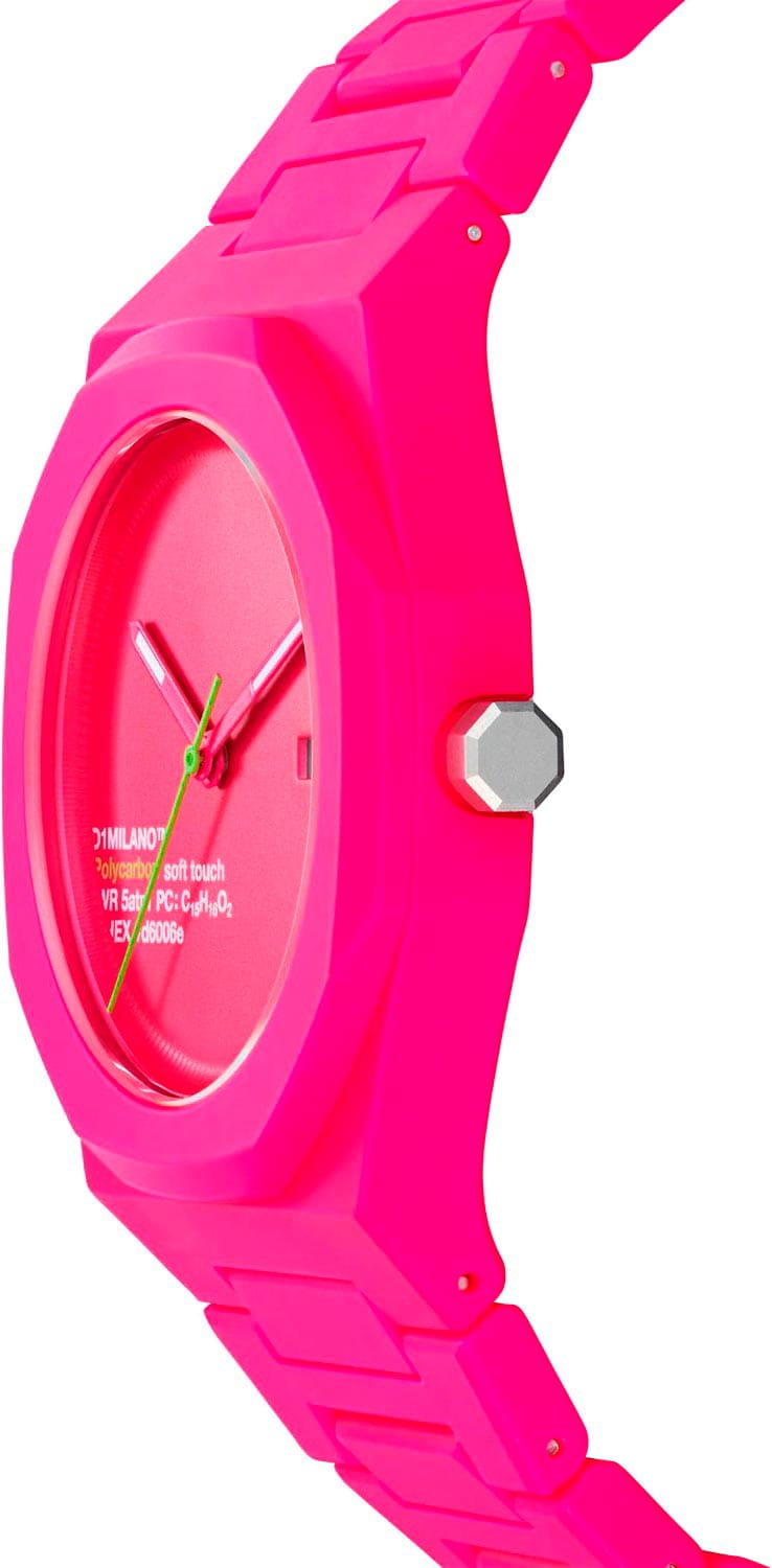 Часы D1 Milano Polycarbon PCBJ32 – молодежные часы в стиле унисекс для повседневных образов. Кварцевые часы с калибром Seiko VJ32B. Модель Hot Pink Polycarbon имеет розовый корпус из поликарбоната с покрытием Софт-Тач. Циферблат лаконичный без индексов, защищен минеральным стекломМинеральное стеклоМинеральное стекло представляет собой искусственно выращенный минерал кварца. Такое стекло отличается особой устойчивостью к повреждениям и царапинам. Уступает по некоторым качествам сапфировому стеклу. с антибликовым покрытием. Стрелки с люминесцентным покрытиемЛюминесцентное покрытиеПозволяет считывать показания времени в темноте. Производители наносят на стрелки, часовые индексы, безель или поверхность циферблата светонакопительный состав, дающий холодное свечение.. Окошко даты находится в положении 3 часов. Контрастная секундная стрелка дополняет стильный образ. Стальная задняя крышка на 4 винтах. Пластиковый браслет с раскладной застёжкойРаскладная застёжкаТакой тип застёжки используется только на браслетах из металла. Она никогда не раскрывается полностью, происходит разделение на 2 и более частей. Раскладывающая застёжка снизит вероятность потери часов к минимуму..