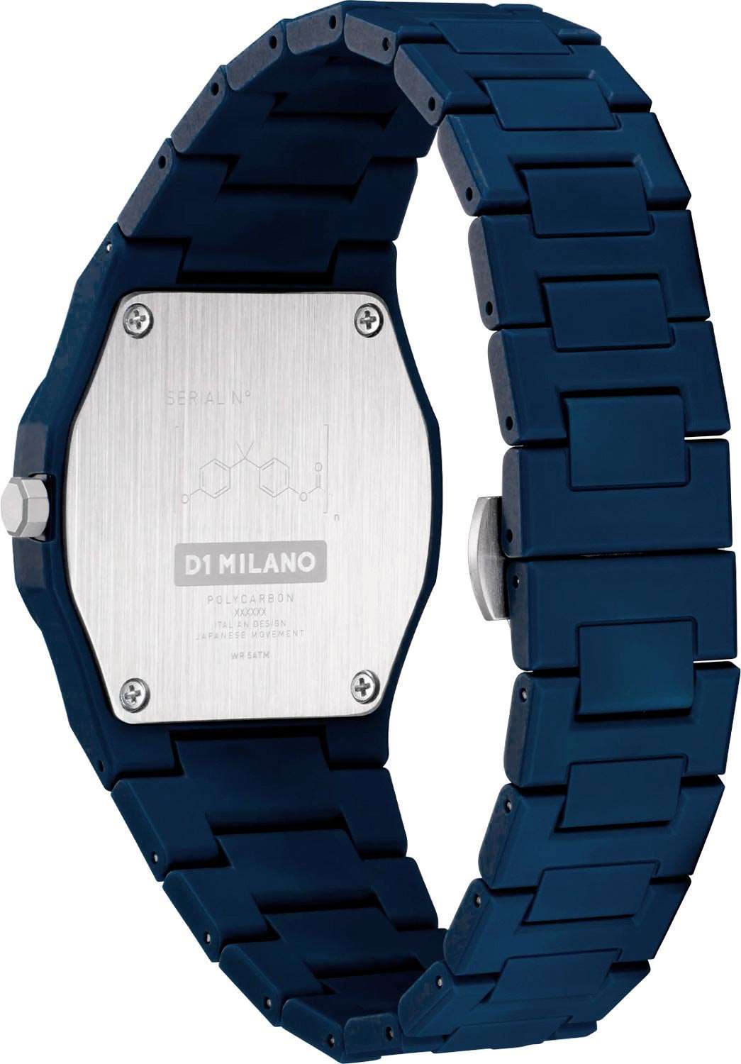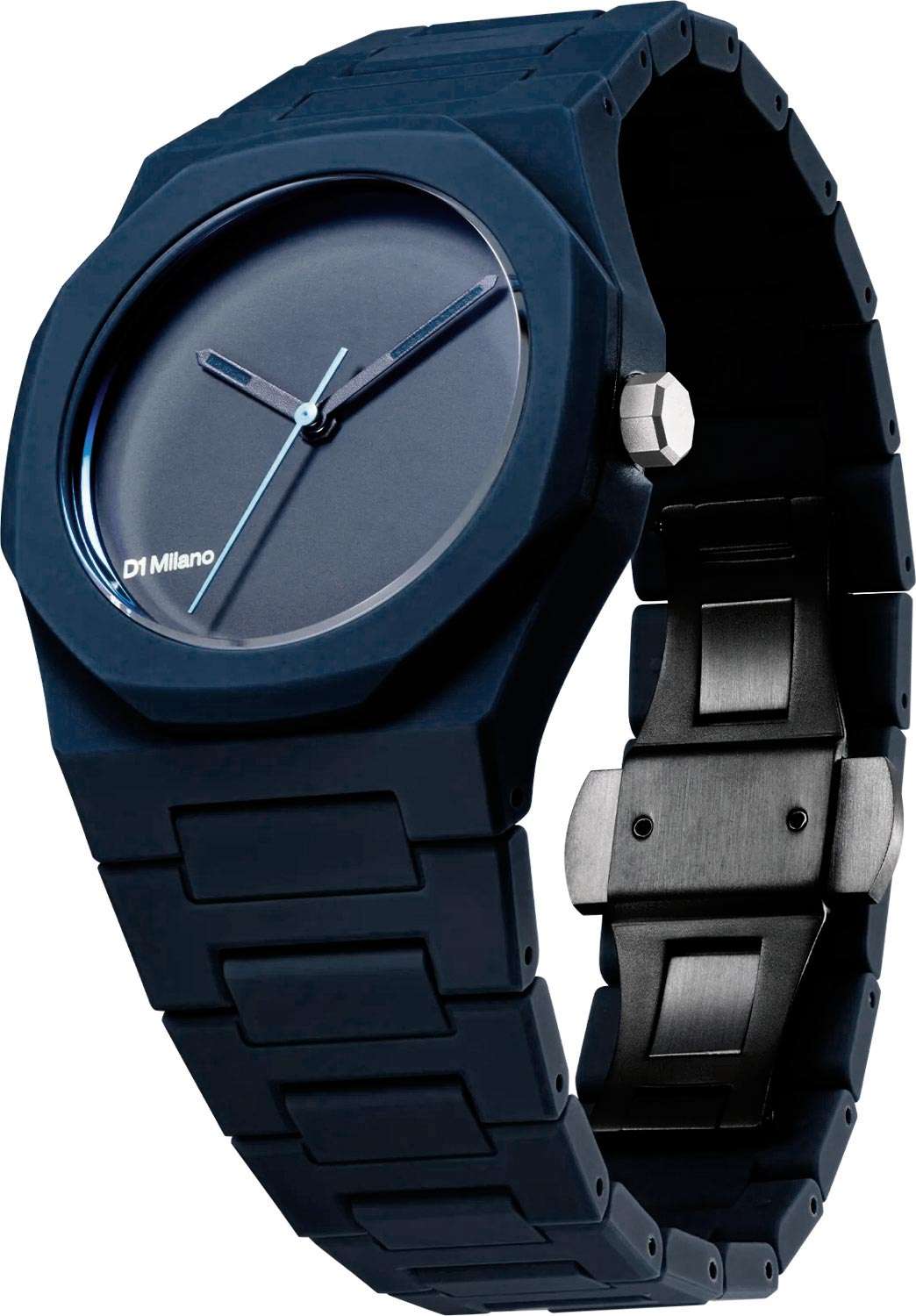 Часы D1 Milano Polycarbon PCBU09 – молодежные часы в стиле унисекс для повседневных образов, стильные и комфортные. Модель имеет темно-синий корпус и браслет из поликарбоната с покрытием Софт-Тач.. Циферблат лаконичный с индексами в виде штрихов, защищен минеральным стекломМинеральное стеклоМинеральное стекло представляет собой искусственно выращенный минерал кварца. Такое стекло отличается особой устойчивостью к повреждениям и царапинам. Уступает по некоторым качествам сапфировому стеклу. с антибликовым покрытием. Стальная задняя крышка на 4 винтах. Пластиковый браслет на застёжке-бабочке с кнопкамиЗастёжка "бабочка"Такой вид застёжки дополняется предохранителями, помогающими избежать случайного раскрытия браслета. Обладают изящным исполнением. .