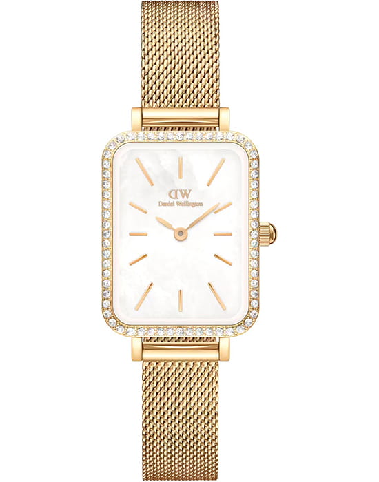Женские наручные часы с минеральным стекломМинеральное стеклоМинеральное стекло представляет собой искусственно выращенный минерал кварца. Такое стекло отличается особой устойчивостью к повреждениям и царапинам. Уступает по некоторым качествам сапфировому стеклу. Daniel Wellington Quadro Lumine Bezel Evergold MOP DW00100668, кварцевый механизм с высокой точностью. Корпус часов изготовлен из нержавеющей стали с PVD-покрытиемPVDУльтратонкое покрытие наносится в технике вакуумного напыления, сочетает в себе нитрид титана особой прочности со слоем золота или оксида хрома. Несёт в себе декоративную или защитную функцию.. БезельБезельВнешний ободок, закрепляющий стекло. В спортивных часах так называется поворотное кольцо с делениями на циферблате, выполняет роль таймера – замеряет отрезки времени на шкале. Неподвижный безель – элемент декора. Однонаправленно вращающийся безель на дайверских часах позволяет фиксировать моменты погружения и выныривания на поверхность. украшен кристаллами Swarovski. Матовый циферблат украшен фирменным логотипом Daniel Wellington. Накладные метки в виде штрихов. Японский кварцевый механизм. Рифленая заводная головка. Класс водозащиты: 30 метров, позволит защитить корпус от случайных брызг или капель дождя. Стальной браслет миланского плетения с PVD-покрытиемPVDУльтратонкое покрытие наносится в технике вакуумного напыления, сочетает в себе нитрид титана особой прочности со слоем золота или оксида хрома. Несёт в себе декоративную или защитную функцию. на раскладном замкеРаскладной замокДанный вариант застежки используется только на часах с металлическим браслетом. Отличительная особенность такого крепления в том, что длина браслета становится универсальной и вы можете самостоятельно отрегулировать нужный вам размер – застежка просто двигается по браслету часов..
