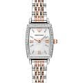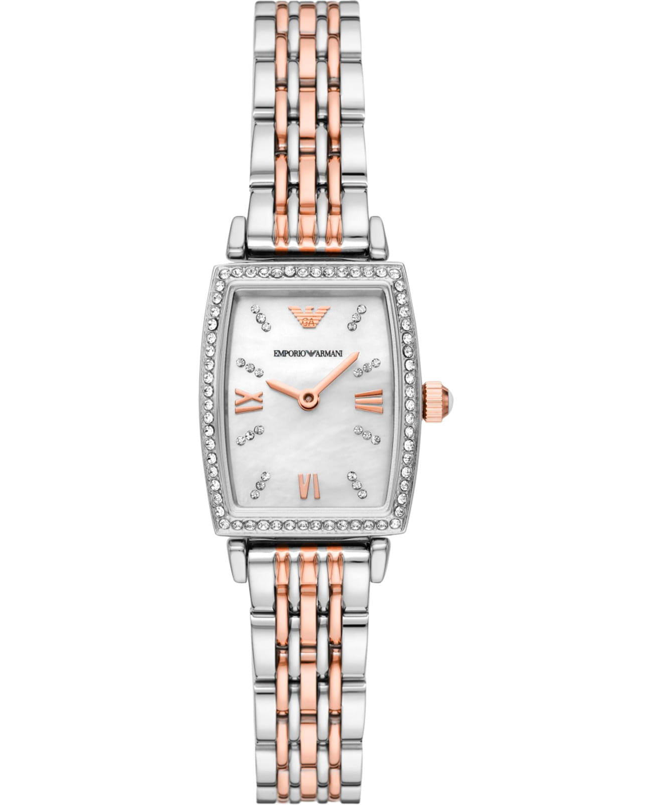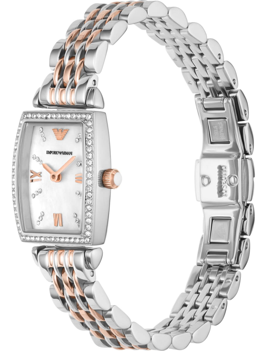 Женские кварцевые часы Emporio Armani из серии Gianni T-Bar — это элегантная новинка, сочетающая итальянский дизайн и японскую точность. Корпус выполнен из нержавеющей стали серебристого цвета и защищён минеральным стекломМинеральное стеклоМинеральное стекло представляет собой искусственно выращенный минерал кварца. Такое стекло отличается особой устойчивостью к повреждениям и царапинам. Уступает по некоторым качествам сапфировому стеклу.. Циферблат прямоугольной формы в перламутровом цвете оформлен римскими цифрами, придающими модели классический и изысканный вид. Браслет из нержавеющей с элементами PVD-покрытияPVDУльтратонкое покрытие наносится в технике вакуумного напыления, сочетает в себе нитрид титана особой прочности со слоем золота или оксида хрома. Несёт в себе декоративную или защитную функцию. стали фиксируется на застёжке «бабочка» с кнопкамиЗастёжка "бабочка"Такой вид застёжки дополняется предохранителями, помогающими избежать случайного раскрытия браслета. Обладают изящным исполнением. , обеспечивая удобство и надёжность ношения. Часы оснащены японским кварцевым механизмом, гарантирующим стабильную и точную работу. Водонепроницаемость составляет 30 WR, что позволяет использовать их в повседневных условиях, защищая от случайных брызг и капель дождя. Модель подчёркивает женственность и утончённый стиль, идеально дополняя любой образ.