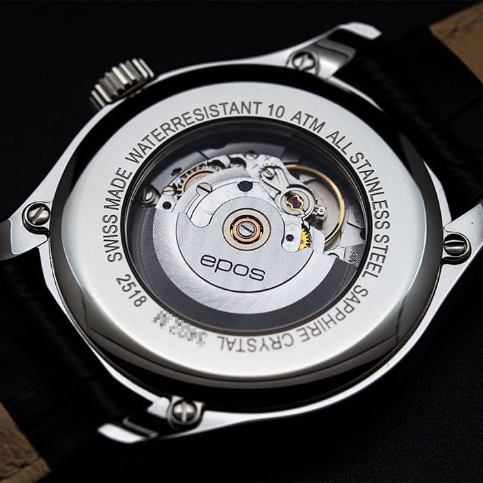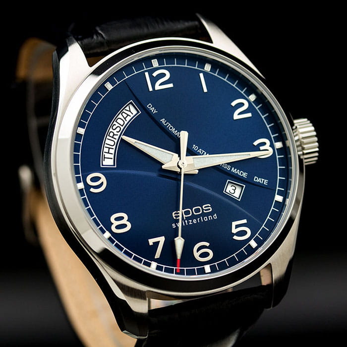 Мужские механические часы с автоподзаводом Epos из коллекции Passion — это сочетание швейцарского мастерства и современного дизайна. Корпус диаметром 43 мм выполнен из нержавеющей стали 316L. Циферблат синего цвета оформлен сатинированным узором «Солнечные лучи» и дополнен окошками даты и дня недели. Циферблат защищён сапфировым стекломСапфировое стеклоПрочный и надёжный материал из кристалла сапфира синтетического происхождения, характеризующийся особой твёрдостью и устойчивостью к царапинам и повреждениям.. Стрелки с люминесцентным покрытиемЛюминесцентное покрытиеПозволяет считывать показания времени в темноте. Производители наносят на стрелки, часовые индексы, безель или поверхность циферблата светонакопительный состав, дающий холодное свечение., обеспечивающим хорошую читаемость в темноте. Механизм — швейцарский калибр ETA 2834 с запасом хода 38 часов. Прозрачная задняя крышка позволяет наблюдать за работой механизма. Часы оснащены кожаным ремешком чёрного цвета со стандартной застёжкой. Водонепроницаемость 100 м позволяет использовать часы для плавания. Гарантия — 24 месяца. Универсальный выбор для ценителя классики и точного механизма.