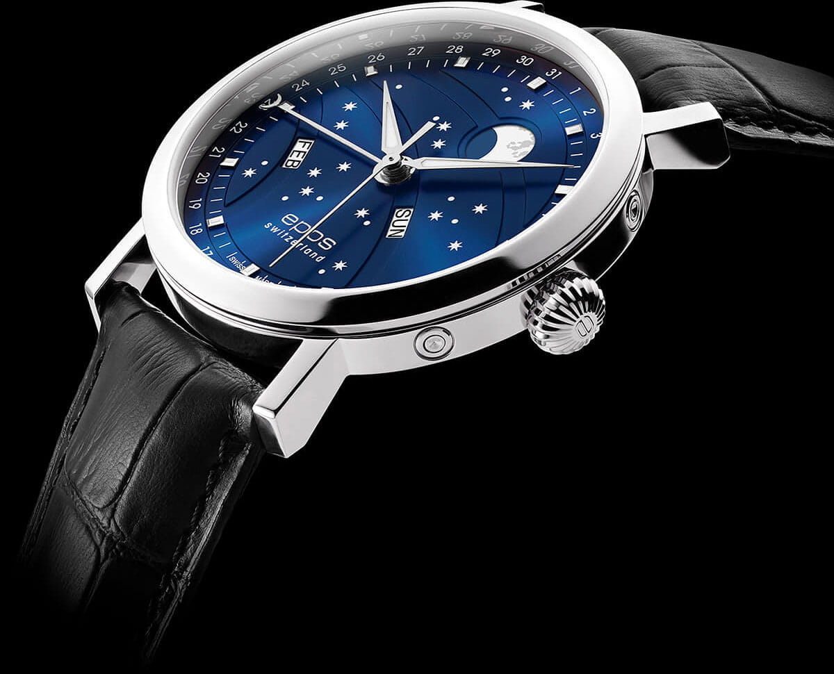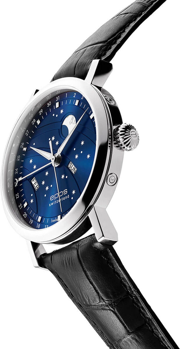 Мужские швейцарские механические часы с автоподзаводом Epos Big Moon 3440.322.20.16.25. Сапфировое стеклоСапфировое стеклоПрочный и надёжный материал из кристалла сапфира синтетического происхождения, характеризующийся особой твёрдостью и устойчивостью к царапинам и повреждениям. устойчивое к появлению царапин, обладающее высокой прозрачностью. Корпус часов изготовлен из нержавеющей стали. Стрелки и метки с люминесцентной подсветкойЛюминесцентное покрытиеПозволяет считывать показания времени в темноте. Производители наносят на стрелки, часовые индексы, безель или поверхность циферблата светонакопительный состав, дающий холодное свечение.. Циферблат с метками в виде точек. Дата отображается центральной стрелкой. Окошки для дня недели и месяца, индикатор фазы Луны. Часовой механизм декорирован жемчужной фактурной шлифовкой (Le Perlage). Прозрачная задняя крышка. Класс водозащиты: 50 метров, позволит защитить корпус от случайных брызг или капель дождя. Кожаный ремешок на стандартной застёжке.