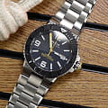 Мужские механические часы с автоподзаводом Epos из коллекции Sportive — это профессиональный дайверский инструмент с швейцарским качеством. Корпус диаметром 43 мм и толщиной 14 мм выполнен из нержавеющей стали 316L. Циферблат чёрного цвета с пескоструйной обработкой оформлен аппликациями часовых индексов и крупными цифрами с покрытием цвета родия. Циферблат защищён сапфировым стекломСапфировое стеклоПрочный и надёжный материал из кристалла сапфира синтетического происхождения, характеризующийся особой твёрдостью и устойчивостью к царапинам и повреждениям.. Стрелки и метки с люминесцентным покрытиемЛюминесцентное покрытиеПозволяет считывать показания времени в темноте. Производители наносят на стрелки, часовые индексы, безель или поверхность циферблата светонакопительный состав, дающий холодное свечение. Super-Luminova, обеспечивающим отличную читаемость в темноте. Механизм — швейцарский калибр ETA 2824 с запасом хода 38 часов. Окошко даты расположено в положении 3 часов. БезельБезельВнешний ободок, закрепляющий стекло. В спортивных часах так называется поворотное кольцо с делениями на циферблате, выполняет роль таймера – замеряет отрезки времени на шкале. Неподвижный безель – элемент декора. Однонаправленно вращающийся безель на дайверских часах позволяет фиксировать моменты погружения и выныривания на поверхность. — керамический, однонаправленный вращающийся, с с PVD-покрытиемPVDУльтратонкое покрытие наносится в технике вакуумного напыления, сочетает в себе нитрид титана особой прочности со слоем золота или оксида хрома. Несёт в себе декоративную или защитную функцию. и рельефной шкалой погружений. Завинчивающаяся коронка и задняя крышка обеспечивают повышенную защиту. Часы оснащены стальным браслетом с литыми звеньями в 3 ряда и раскладной застёжкойРаскладная застёжкаТакой тип застёжки используется только на браслетах из металла. Она никогда не раскрывается полностью, происходит разделение на 2 и более частей. Раскладывающая застёжка снизит вероятность потери часов к минимуму. с двойной блокировкой и дополнительным фиксатором. Автоматический гелиевый клапан позволяет использовать часы при профессиональном дайвинге. Водонепроницаемость 500 м соответствует требованиям для глубоководных погружений. Гарантия — 24 месяца. Идеальный выбор для тех, кто ценит надёжность, точность и экстремальные испытания.