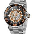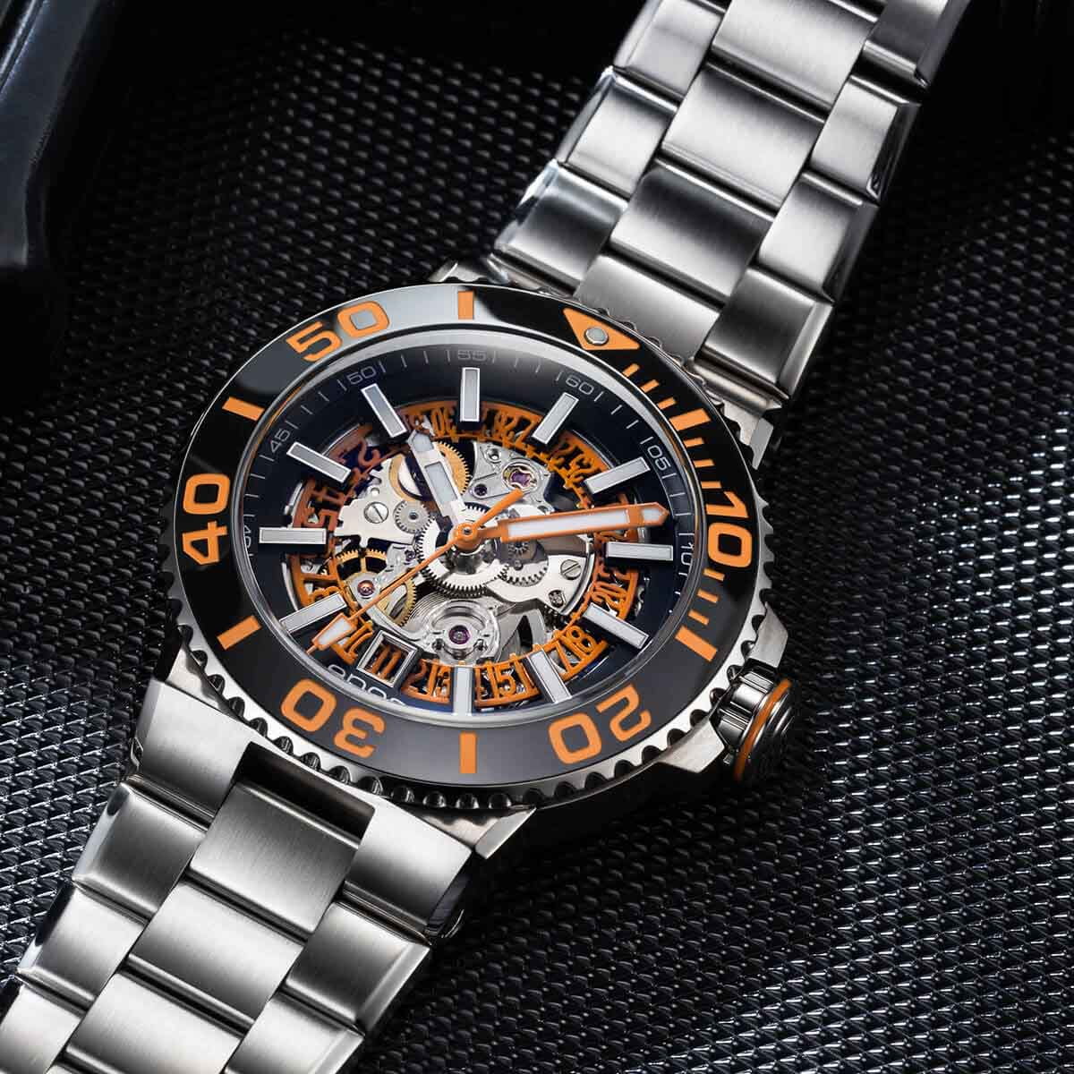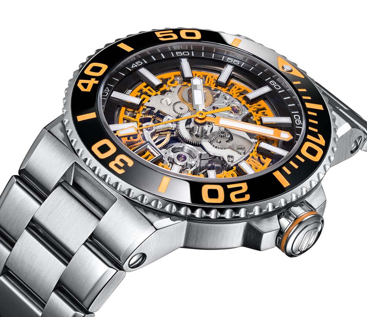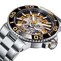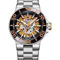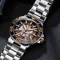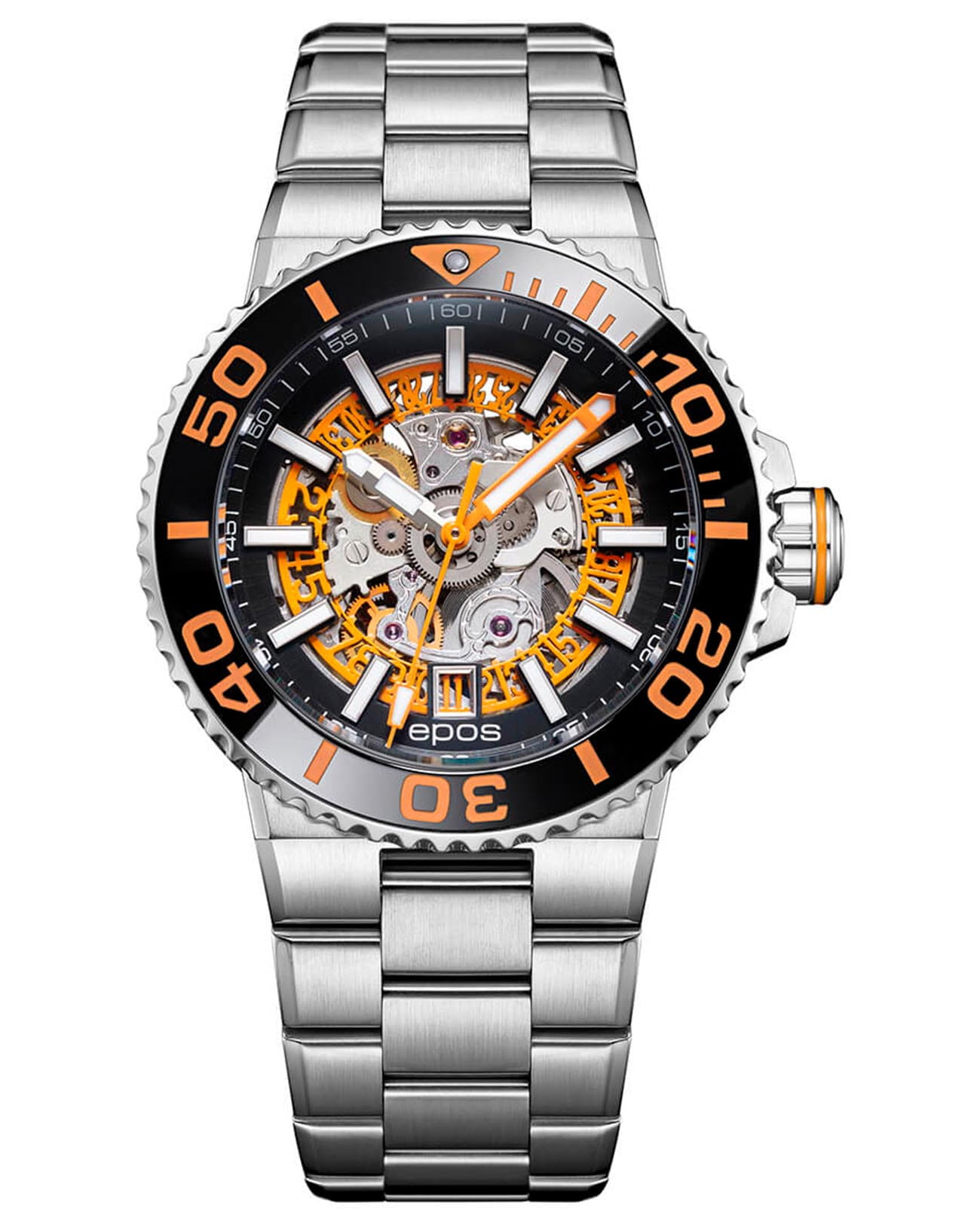 Мужские механические часы с автоподзаводом Epos из коллекции Sportive — это профессиональный дайверский инструмент с элементами скелетонизации и швейцарским качеством. Корпус диаметром 43 мм и толщиной 14 мм выполнен из нержавеющей стали 316L. Циферблат оранжевого цвета частично скелетонизирован, что открывает вид на сложную структуру механизма. Циферблат защищён сапфировым стекломСапфировое стеклоПрочный и надёжный материал из кристалла сапфира синтетического происхождения, характеризующийся особой твёрдостью и устойчивостью к царапинам и повреждениям.. Аппликации часовых индексов, крупные цифры и стрелки выполнены с покрытием. Стрелки и метки с люминесцентным покрытиемЛюминесцентное покрытиеПозволяет считывать показания времени в темноте. Производители наносят на стрелки, часовые индексы, безель или поверхность циферблата светонакопительный состав, дающий холодное свечение. Super-Luminova, обеспечивающим отличную читаемость в темноте. Механизм — швейцарский калибр Sellita SW200 с запасом хода 38 часов. Индикация даты реализована через скелетонизированный диск. БезельБезельВнешний ободок, закрепляющий стекло. В спортивных часах так называется поворотное кольцо с делениями на циферблате, выполняет роль таймера – замеряет отрезки времени на шкале. Неподвижный безель – элемент декора. Однонаправленно вращающийся безель на дайверских часах позволяет фиксировать моменты погружения и выныривания на поверхность. — однонаправленный вращающийся, с керамической накладкой чёрного цвета и рельефной шкалой погружений. Завинчивающаяся коронка и задняя крышка с прозрачным окном обеспечивают повышенную защиту и демонстрируют декор механизма. Автоматический гелиевый клапан позволяет использовать часы при профессиональном дайвинге. Часы оснащены стальным браслетом с литыми звеньями в 3 ряда и раскладной застёжкойРаскладная застёжкаТакой тип застёжки используется только на браслетах из металла. Она никогда не раскрывается полностью, происходит разделение на 2 и более частей. Раскладывающая застёжка снизит вероятность потери часов к минимуму. с двойной блокировкой и дополнительным фиксатором. Водонепроницаемость 500 м соответствует требованиям для глубоководных погружений. Гарантия — 24 месяца. Идеальный выбор для тех, кто ценит надёжность, техническое совершенство и экстремальные испытания.