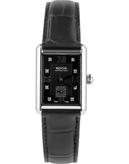 Epos 8002.702.20.85.15 — женская модель с утончённым классическим стилем и прямоугольным корпусом, выполненным из нержавеющей стали. Чёрный циферблат оформлен римскими индексами и утончённым узором «Clous de Paris», создающим игру света и подчёркивающим глубину дизайна, так же инкрустирован бриллиантами. Защитную функцию выполняет сапфировое стеклоСапфировое стеклоПрочный и надёжный материал из кристалла сапфира синтетического происхождения, характеризующийся особой твёрдостью и устойчивостью к царапинам и повреждениям., стойкое к царапинам и сохраняющее прозрачность. В основе лежит швейцарский автоматический механизм, обеспечивающий стабильность и точность хода. Функции включают индикацию часов, минут и малую секундную шкалу, расположенную в позиции «6 часов». Часы дополнены кожаным ремешком классического чёрного цвета, который гармонично завершает строгий образ модели.