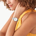 Женские наручные часы с минеральным стекломМинеральное стеклоМинеральное стекло представляет собой искусственно выращенный минерал кварца. Такое стекло отличается особой устойчивостью к повреждениям и царапинам. Уступает по некоторым качествам сапфировому стеклу. Fossil Laney BQ3861, кварцевый механизм с высокой точностью. Класс водозащиты: 50 метров, позволит защитить корпус от случайных брызг или капель дождя. Метки в виде кристаллов. Рифленая заводная головка. Браслет с раскладной застёжкойРаскладная застёжкаТакой тип застёжки используется только на браслетах из металла. Она никогда не раскрывается полностью, происходит разделение на 2 и более частей. Раскладывающая застёжка снизит вероятность потери часов к минимуму..