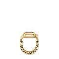 Женские кварцевые часы-кольцо Fossil — это элегантный и уникальный аксессуар в классическом стиле. Модель ES5411 выполнена в виде кольца с прямоугольным корпусом размером 14 мм из нержавеющей стали с IP-покрытиемIP-покрытиеМетод ионного напыления. Демонстрирует повышенную устойчивость к истиранию, окислению и химическим веществам. Под воздействием высокого давления и температуры около 1500°C молекулы металла надёжно соединяются с частицами корпуса часов. цвета жёлтого золота. Циферблат комбинированного дизайна выполнен из перламутра чёрного оттенка, эффектно переливающегося на свету. Циферблат защищён минеральным стекломМинеральное стеклоМинеральное стекло представляет собой искусственно выращенный минерал кварца. Такое стекло отличается особой устойчивостью к повреждениям и царапинам. Уступает по некоторым качествам сапфировому стеклу.. Часы оснащены двумя стрелками и не имеют индикации даты. Ремешок представляет собой расширяемый браслет (expansion band) из стали с IP-покрытиемIP-покрытиеМетод ионного напыления. Демонстрирует повышенную устойчивость к истиранию, окислению и химическим веществам. Под воздействием высокого давления и температуры около 1500°C молекулы металла надёжно соединяются с частицами корпуса часов., обеспечивающий идеальную посадку на пальце (размер кольца 6,5–8). Водонепроницаемость 50 м позволяет использовать часы в повседневных условиях. Идеальный выбор для тех, кто ценит оригинальный дизайн и американское качество.