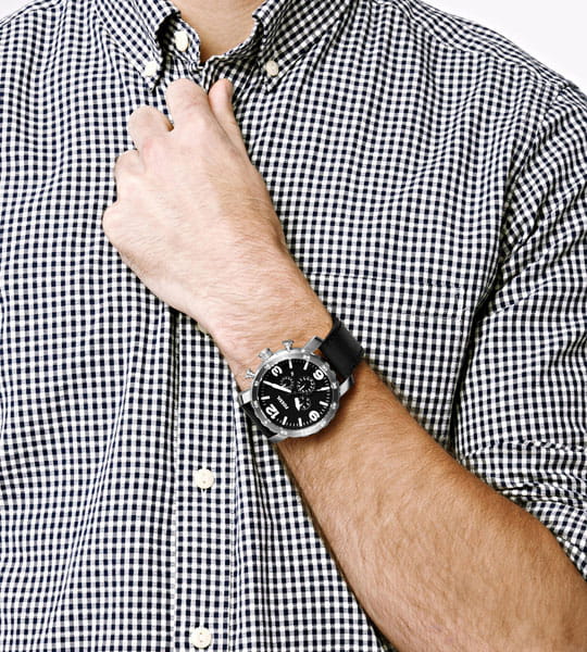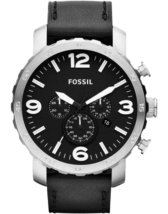 Наручные часы-хронографХронографФункция позволяет измерять отрезки времени с особой точностью: часы, минуты, секунды. Верным признаком хронографа является наличие на циферблате 3 дополнительных окошек-счётчиков. Fossil Nate Chronograph JR1436. Корпус часов изготовлен из нержавеющей стали. Минеральное стеклоМинеральное стеклоМинеральное стекло представляет собой искусственно выращенный минерал кварца. Такое стекло отличается особой устойчивостью к повреждениям и царапинам. Уступает по некоторым качествам сапфировому стеклу. устойчивое к появлению царапин, обладающее высокой прозрачностью. Стрелки и метки с люминесцентным покрытиемЛюминесцентное покрытиеПозволяет считывать показания времени в темноте. Производители наносят на стрелки, часовые индексы, безель или поверхность циферблата светонакопительный состав, дающий холодное свечение.. Кожаный ремешок. Водозащита: 50 метров, позволит защитить корпус от случайных брызг или капель дождя.