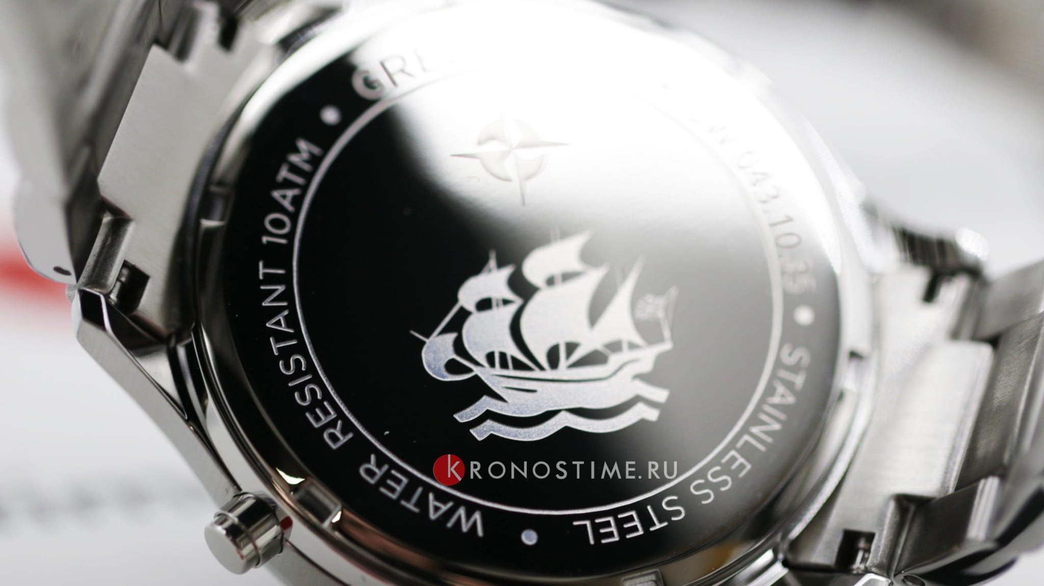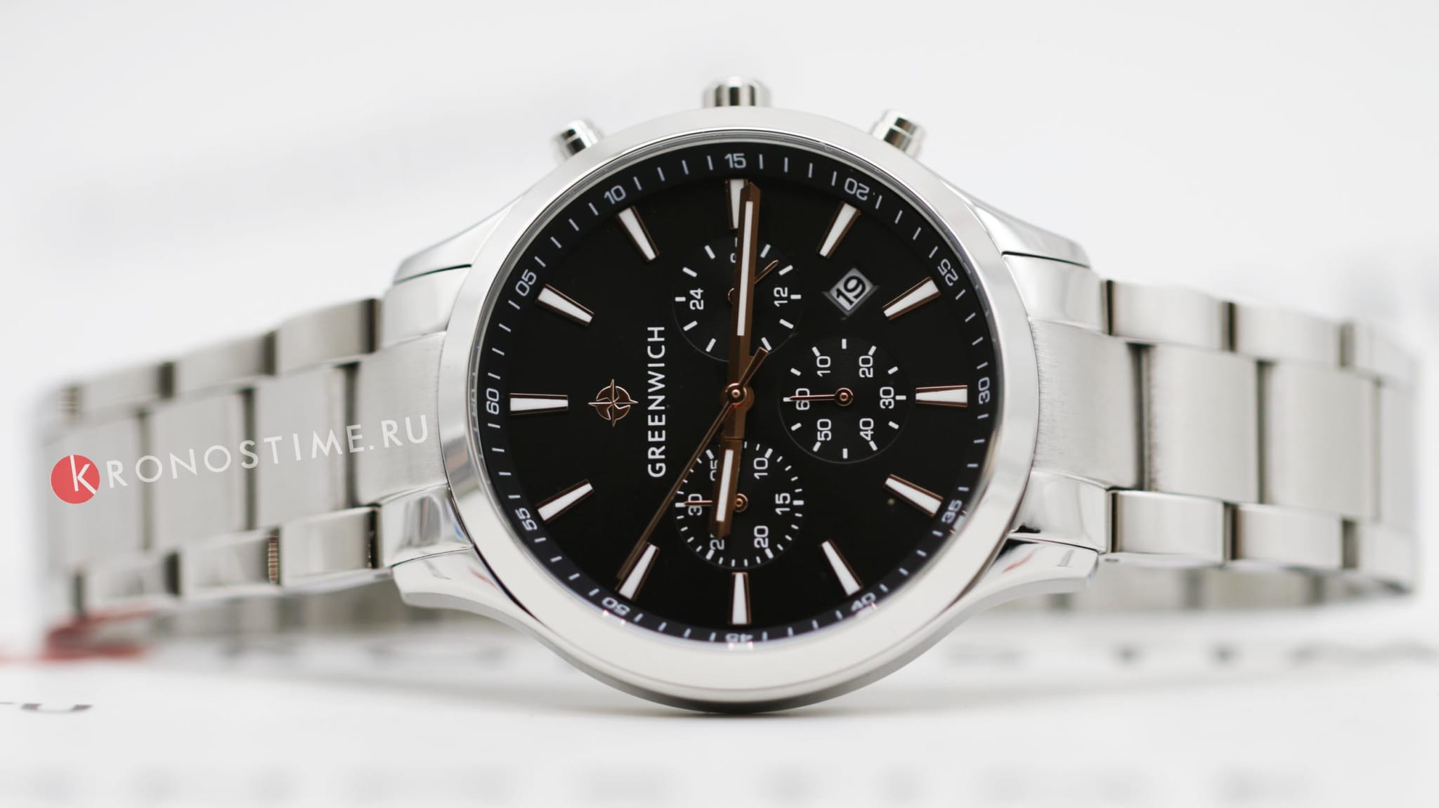 Мужские часы-хронографХронографФункция позволяет измерять отрезки времени с особой точностью: часы, минуты, секунды. Верным признаком хронографа является наличие на циферблате 3 дополнительных окошек-счётчиков.Greenwich Skipper GW 043.10.35, кварцевый механизм с высокой точностью. Минеральное стеклоМинеральное стеклоМинеральное стекло представляет собой искусственно выращенный минерал кварца. Такое стекло отличается особой устойчивостью к повреждениям и царапинам. Уступает по некоторым качествам сапфировому стеклу. устойчивое к появлению царапин, обладающее высокой прозрачностью. Корпус изготовлен из нержавеющей стали. В часах установлен надежный японский механизм с функциями: часы, минуты, секунды, дата, 24-х часовой индикатор. Окошко даты находится в положении между 4 и 5 часами. Стрелки с люминесцентным покрытиемЛюминесцентное покрытиеПозволяет считывать показания времени в темноте. Производители наносят на стрелки, часовые индексы, безель или поверхность циферблата светонакопительный состав, дающий холодное свечение.. Класс водозащиты: 100 метров, позволит плавать, нырять и заниматься другими водными видами спорта. Стальной браслет на раскладной застёжкеРаскладная застёжкаТакой тип застёжки используется только на браслетах из металла. Она никогда не раскрывается полностью, происходит разделение на 2 и более частей. Раскладывающая застёжка снизит вероятность потери часов к минимуму..