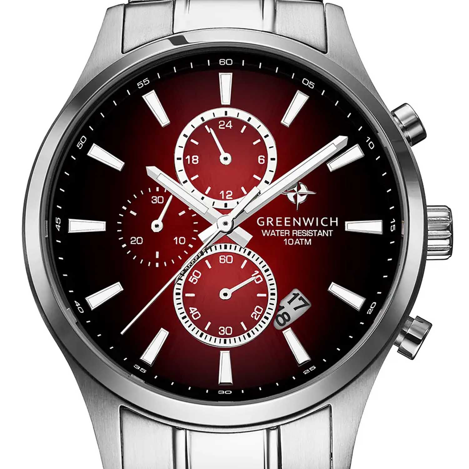 Мужские наручные часы-хронографХронографФункция позволяет измерять отрезки времени с особой точностью: часы, минуты, секунды. Верным признаком хронографа является наличие на циферблате 3 дополнительных окошек-счётчиков. Greenwich Navigator GW 053.10.35 представляют собой классический вариант для повседневной носки. Циферблат украшается брендовым логотипом, изображающим Розу Ветров. Эмблема мореплавательского духа символизирует удачу, стремление достигнуть поставленной цели. Часы характеризуются традиционными формами, лаконичным исполнением, что делает модель элегантным дополнением к деловому костюму. Надёжный корпус из нержавеющей стали спасает японский механизм от повреждений и ударов. Минеральное стеклоМинеральное стеклоМинеральное стекло представляет собой искусственно выращенный минерал кварца. Такое стекло отличается особой устойчивостью к повреждениям и царапинам. Уступает по некоторым качествам сапфировому стеклу. отличается устойчивостью к образованию царапин на поверхности. СекундомерСекундомерСекундоме́р — прибор, способный измерять интервалы времени с точностью до долей секунды.. Стрелки и метки с люминесцентным покрытиемЛюминесцентное покрытиеПозволяет считывать показания времени в темноте. Производители наносят на стрелки, часовые индексы, безель или поверхность циферблата светонакопительный состав, дающий холодное свечение.. Стальной браслет на раскладной застёжкеРаскладная застёжкаТакой тип застёжки используется только на браслетах из металла. Она никогда не раскрывается полностью, происходит разделение на 2 и более частей. Раскладывающая застёжка снизит вероятность потери часов к минимуму.. Окошко даты находится в положении между 4 и 5 часов. Класс водозащиты: 100 метров, позволит плавать, нырять и заниматься другими водными видами спорта.