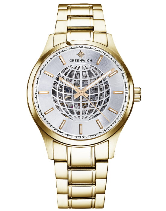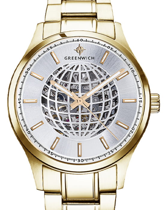 Мужские механические часы с минеральным стекломМинеральное стеклоМинеральное стекло представляет собой искусственно выращенный минерал кварца. Такое стекло отличается особой устойчивостью к повреждениям и царапинам. Уступает по некоторым качествам сапфировому стеклу. Greenwich Globe GW 056.20.33. Корпус часов изготовлен из стали с PVD-покрытиемPVDУльтратонкое покрытие наносится в технике вакуумного напыления, сочетает в себе нитрид титана особой прочности со слоем золота или оксида хрома. Несёт в себе декоративную или защитную функцию.. Стрелки с люминесцентным покрытиемЛюминесцентное покрытиеПозволяет считывать показания времени в темноте. Производители наносят на стрелки, часовые индексы, безель или поверхность циферблата светонакопительный состав, дающий холодное свечение.. Класс водозащиты: 100 метров, позволит плавать, нырять и заниматься другими водными видами спорта. Стальной браслет на раскладной застёжкеРаскладная застёжкаТакой тип застёжки используется только на браслетах из металла. Она никогда не раскрывается полностью, происходит разделение на 2 и более частей. Раскладывающая застёжка снизит вероятность потери часов к минимуму. с PVD-покрытиемPVDУльтратонкое покрытие наносится в технике вакуумного напыления, сочетает в себе нитрид титана особой прочности со слоем золота или оксида хрома. Несёт в себе декоративную или защитную функцию..