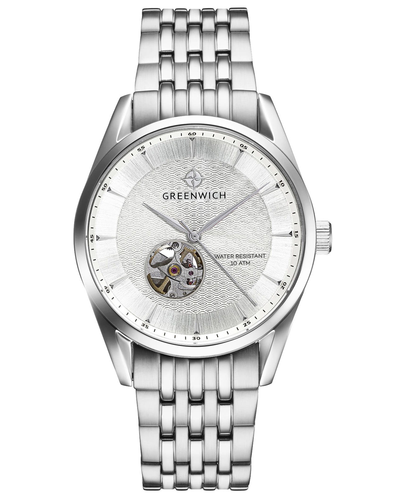 Мужские механические часы с минеральным стекломМинеральное стеклоМинеральное стекло представляет собой искусственно выращенный минерал кварца. Такое стекло отличается особой устойчивостью к повреждениям и царапинам. Уступает по некоторым качествам сапфировому стеклу. Greenwich Good Luck Deep GW 075.10.33. Корпус часов изготовлен из стали. Стрелки с люминесцентным покрытиемЛюминесцентное покрытиеПозволяет считывать показания времени в темноте. Производители наносят на стрелки, часовые индексы, безель или поверхность циферблата светонакопительный состав, дающий холодное свечение.. Класс водозащиты: 100 метров, позволит плавать, нырять и заниматься другими водными видами спорта. Стальной браслет на раскладной застёжкеРаскладная застёжкаТакой тип застёжки используется только на браслетах из металла. Она никогда не раскрывается полностью, происходит разделение на 2 и более частей. Раскладывающая застёжка снизит вероятность потери часов к минимуму..