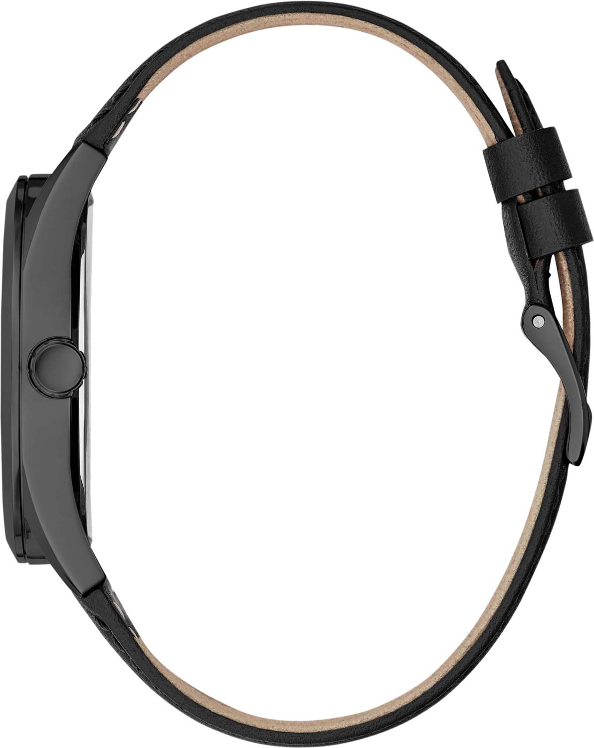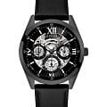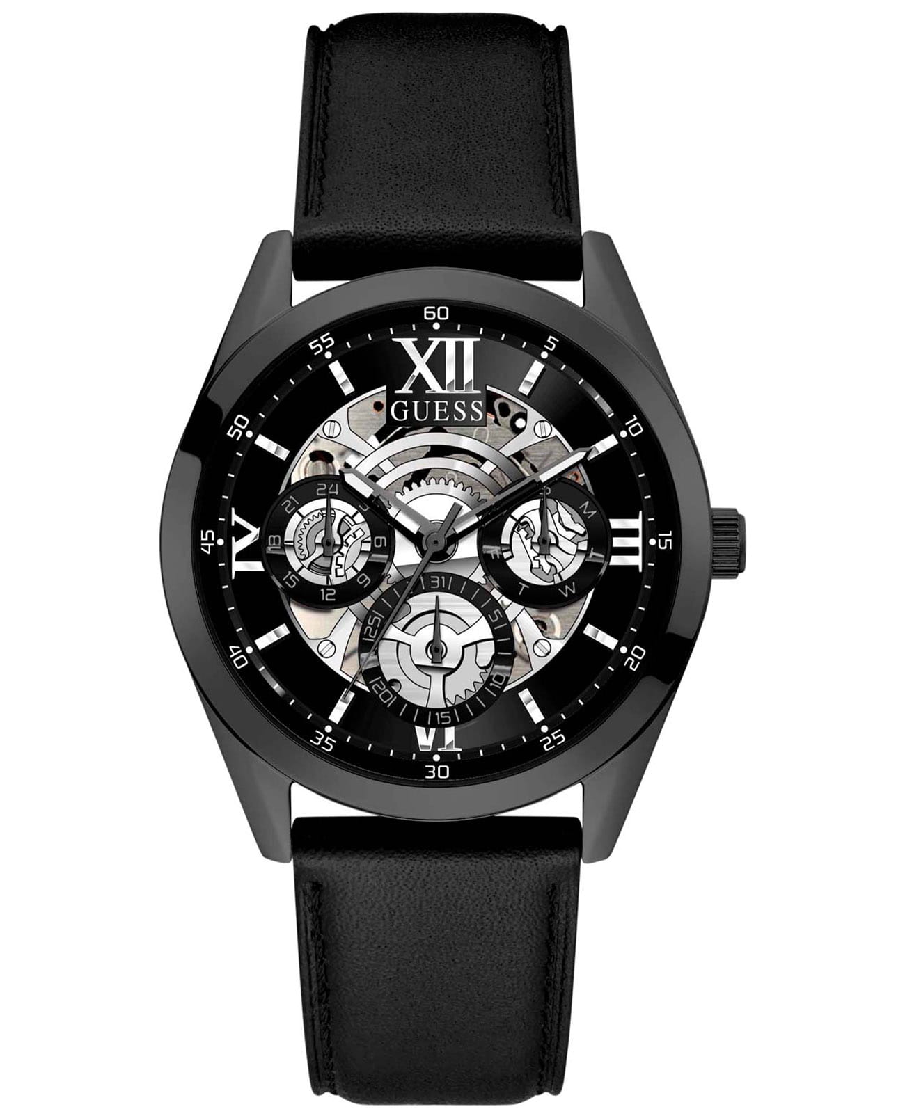 Мужские кварцевые часы-скелетоны с минеральным стекломМинеральное стеклоМинеральное стекло представляет собой искусственно выращенный минерал кварца. Такое стекло отличается особой устойчивостью к повреждениям и царапинам. Уступает по некоторым качествам сапфировому стеклу. Guess Dress Steel GW0389G4, кварцевый механизм с высокой точностью. Класс водозащиты: 50 метров, позволит защитить корпус от случайных брызг или капель дождя. Корпус часов изготовлен из стали с PVD-покрытиемPVDУльтратонкое покрытие наносится в технике вакуумного напыления, сочетает в себе нитрид титана особой прочности со слоем золота или оксида хрома. Несёт в себе декоративную или защитную функцию.. Кожаный ремешок на стандартной застёжке. Стрелки и метки с люминесцентным покрытиемЛюминесцентное покрытиеПозволяет считывать показания времени в темноте. Производители наносят на стрелки, часовые индексы, безель или поверхность циферблата светонакопительный состав, дающий холодное свечение.. 12-ти и 24-х часовой формат времени. Циферблат выполнен по технологии Sunray (солнечные лучи). 24-х часовой формат времени, число и день недели отображаются на отдельных циферблатах. Рифленая заводная головка.