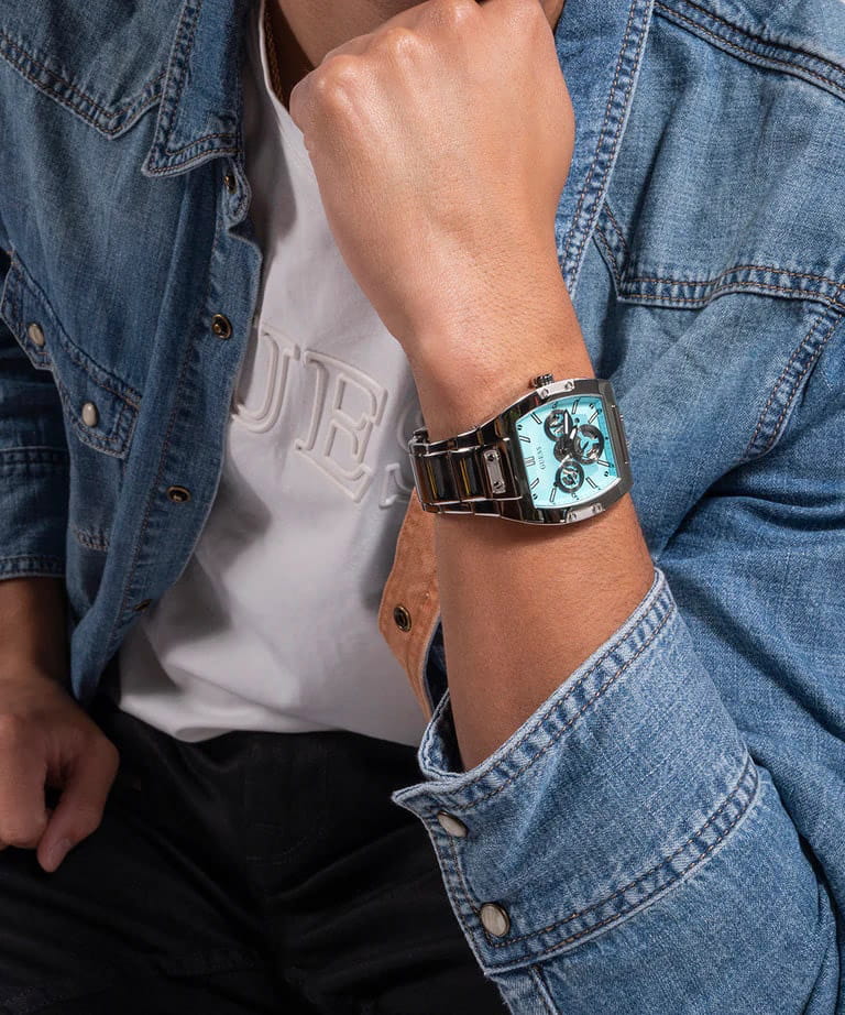 Мужские наручные часы Guess Trend GW0456G4 с минеральным стекломМинеральное стеклоМинеральное стекло представляет собой искусственно выращенный минерал кварца. Такое стекло отличается особой устойчивостью к повреждениям и царапинам. Уступает по некоторым качествам сапфировому стеклу., кварцевый механизм с высокой точностью. Класс водозащиты: 50 метров, позволит защитить корпус от случайных брызг или капель дождя. Корпус часов изготовлен из стали с IP-покрытиемIP-покрытиеМетод ионного напыления. Демонстрирует повышенную устойчивость к истиранию, окислению и химическим веществам. Под воздействием высокого давления и температуры около 1500°C молекулы металла надёжно соединяются с частицами корпуса часов.. Стальной браслет с раскладной застёжкойРаскладная застёжкаТакой тип застёжки используется только на браслетах из металла. Она никогда не раскрывается полностью, происходит разделение на 2 и более частей. Раскладывающая застёжка снизит вероятность потери часов к минимуму.