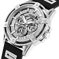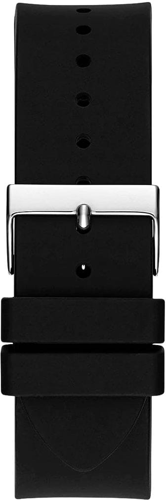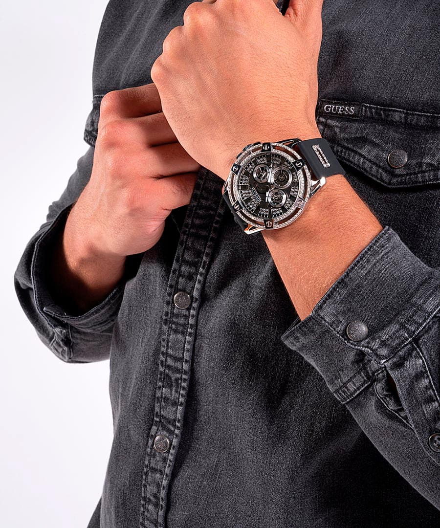 Мужские наручные часы Guess GW0537G1 с минеральным стекломМинеральное стеклоМинеральное стекло представляет собой искусственно выращенный минерал кварца. Такое стекло отличается особой устойчивостью к повреждениям и царапинам. Уступает по некоторым качествам сапфировому стеклу., кварцевый механизм с высокой точностью. Класс водозащиты: 50 метров, позволит защитить корпус от случайных брызг или капель дождя. Стрелки с люминесцентным покрытиемЛюминесцентное покрытиеПозволяет считывать показания времени в темноте. Производители наносят на стрелки, часовые индексы, безель или поверхность циферблата светонакопительный состав, дающий холодное свечение.. Корпус часов изготовлен из стали. Силиконовый ремешок на стандартной застёжке. Корпус и циферблат украшены кристаллами.