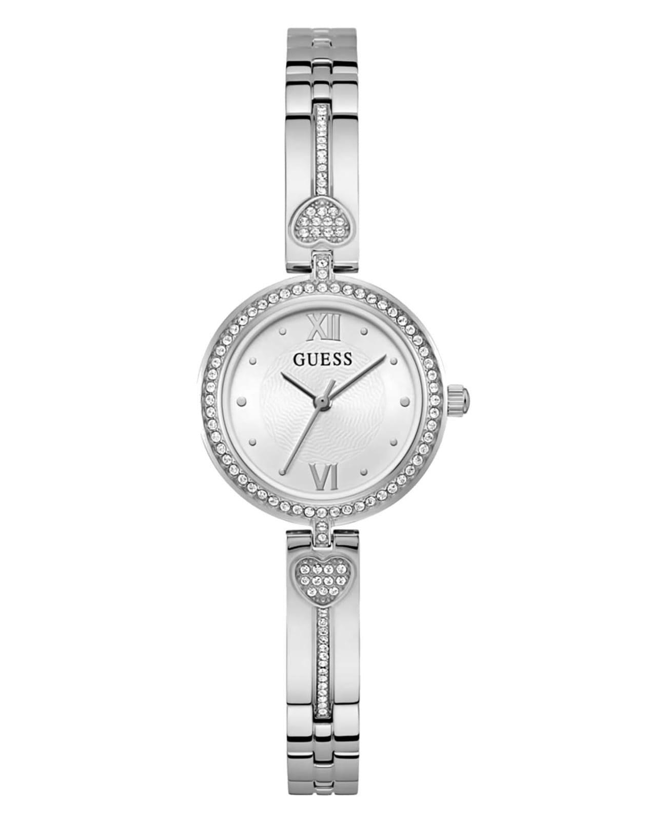Женские наручные часы с минеральным стекломМинеральное стеклоМинеральное стекло представляет собой искусственно выращенный минерал кварца. Такое стекло отличается особой устойчивостью к повреждениям и царапинам. Уступает по некоторым качествам сапфировому стеклу. Guess Dress GW0655L1 с минеральным стекломМинеральное стеклоМинеральное стекло представляет собой искусственно выращенный минерал кварца. Такое стекло отличается особой устойчивостью к повреждениям и царапинам. Уступает по некоторым качествам сапфировому стеклу., кварцевый механизм с высокой точностью. Корпус часов изготовлен из стали. БезельБезельВнешний ободок, закрепляющий стекло. В спортивных часах так называется поворотное кольцо с делениями на циферблате, выполняет роль таймера – замеряет отрезки времени на шкале. Неподвижный безель – элемент декора. Однонаправленно вращающийся безель на дайверских часах позволяет фиксировать моменты погружения и выныривания на поверхность. украшен кристаллами. Класс водозащиты: 30 метров, позволит защитить корпус от случайных брызг или капель дождя. Стальной браслет частично укарашен кристаллами на ювелирной застёжке.
