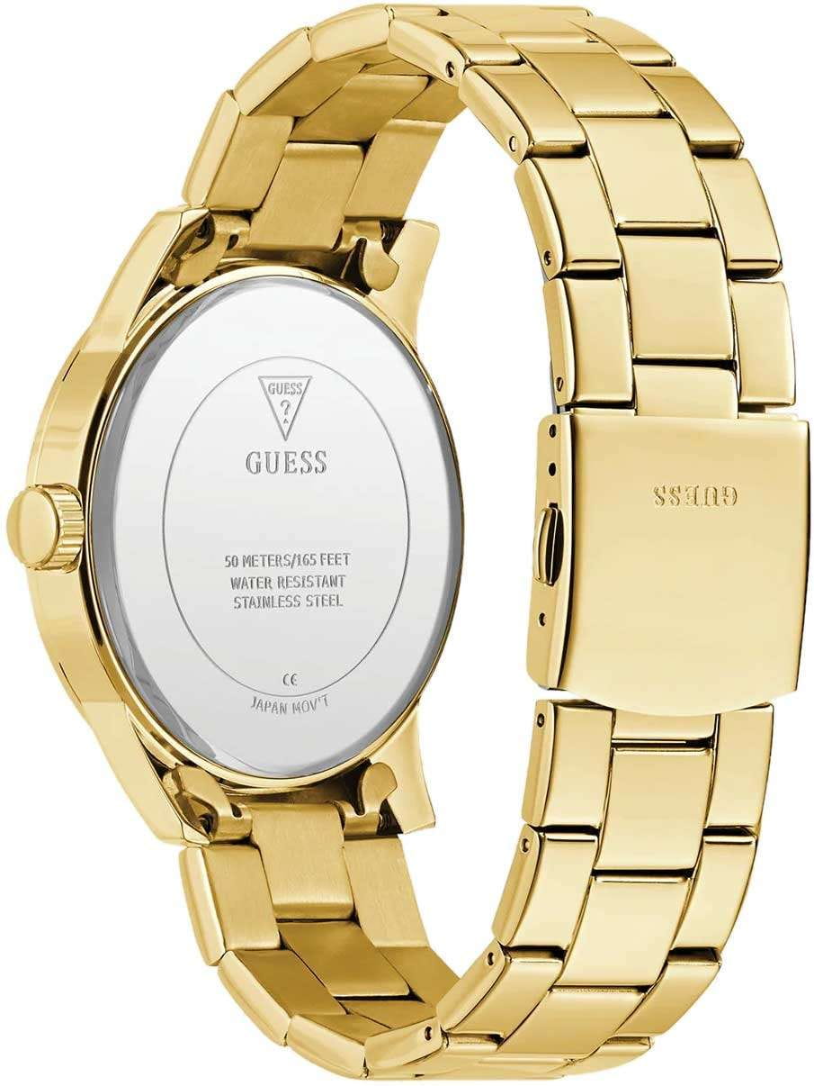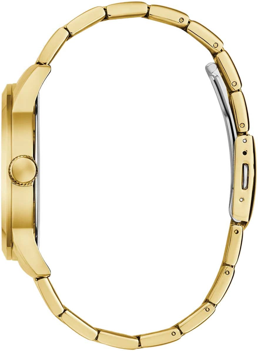 Мужские наручные часы Guess GW0888G2 представляют собой идеальное сочетание современного дизайна и функциональности. Кварцевый механизм гарантирует высокую точность хода, а стальной корпус с золотистым IP-покрытиемIP-покрытиеМетод ионного напыления. Демонстрирует повышенную устойчивость к истиранию, окислению и химическим веществам. Под воздействием высокого давления и температуры около 1500°C молекулы металла надёжно соединяются с частицами корпуса часов. придает аксессуару стильный и устойчивый к внешним воздействиям вид. Диаметр корпуса создает гармонию между элегантностью и практичностью, делая часы привлекательным дополнением к любому образу. Черный циферблат, выполненный по технологии Sunray, создает эффект солнечных лучей, добавляя глубины и игры света при каждом движении. Люминесцентное покрытиеЛюминесцентное покрытиеПозволяет считывать показания времени в темноте. Производители наносят на стрелки, часовые индексы, безель или поверхность циферблата светонакопительный состав, дающий холодное свечение. на стрелках обеспечивает отличную видимость в темноте. Рифленая заводная головка добавляет изделию изысканный акцент и подчеркивает внимание к деталям. Стальной браслет с золотистым IP-покрытиемIP-покрытиеМетод ионного напыления. Демонстрирует повышенную устойчивость к истиранию, окислению и химическим веществам. Под воздействием высокого давления и температуры около 1500°C молекулы металла надёжно соединяются с частицами корпуса часов. обеспечивает надежность и долговечность, а раскладная застежкаРаскладная застёжкаТакой тип застёжки используется только на браслетах из металла. Она никогда не раскрывается полностью, происходит разделение на 2 и более частей. Раскладывающая застёжка снизит вероятность потери часов к минимуму. гарантирует удобство и безопасность при ношении. Водозащита 30WR защищает часы от случайных брызг и дождя, что делает их подходящими для повседневной жизни. Минеральное стеклоМинеральное стеклоМинеральное стекло представляет собой искусственно выращенный минерал кварца. Такое стекло отличается особой устойчивостью к повреждениям и царапинам. Уступает по некоторым качествам сапфировому стеклу. защищает циферблат от царапин, сохраняя его первозданный вид. Эти часы станут отличным выбором для мужчин, ценящих качество, стиль и надежность в одном аксессуаре.