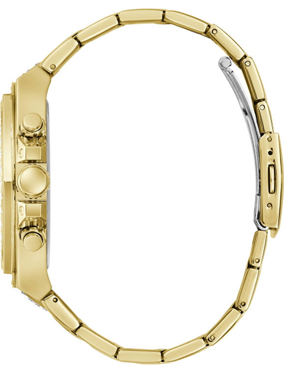 Мужские наручные часы Guess GW0899G2 – это сочетание элегантности и современного стиля. Они оснащены надежным кварцевым механизмом, который обеспечивает точность хода. Корпус часов выполнен из стали с PVD-покрытиемPVDУльтратонкое покрытие наносится в технике вакуумного напыления, сочетает в себе нитрид титана особой прочности со слоем золота или оксида хрома. Несёт в себе декоративную или защитную функцию. золотистого цвета, безельБезельВнешний ободок, закрепляющий стекло. В спортивных часах так называется поворотное кольцо с делениями на циферблате, выполняет роль таймера – замеряет отрезки времени на шкале. Неподвижный безель – элемент декора. Однонаправленно вращающийся безель на дайверских часах позволяет фиксировать моменты погружения и выныривания на поверхность. декорирован кристаллами и винтами, придающими модели особый характер. Золотистый циферблат инкрустирован кристаллами и оснащен метками в виде штрихов, что добавляет изысканности и блеска. Часы поддерживают 12-ти и 24-х часовой формат времени, а также оснащены календарем, показывающим число и день недели на отдельных циферблатах. Люминесцентное покрытиеЛюминесцентное покрытиеПозволяет считывать показания времени в темноте. Производители наносят на стрелки, часовые индексы, безель или поверхность циферблата светонакопительный состав, дающий холодное свечение. на стрелках обеспечивает отличную видимость в темноте. Стальной браслет с раскладной застежкойРаскладная застёжкаТакой тип застёжки используется только на браслетах из металла. Она никогда не раскрывается полностью, происходит разделение на 2 и более частей. Раскладывающая застёжка снизит вероятность потери часов к минимуму. гарантирует комфортное ношение и надежную фиксацию. Минеральное стеклоМинеральное стеклоМинеральное стекло представляет собой искусственно выращенный минерал кварца. Такое стекло отличается особой устойчивостью к повреждениям и царапинам. Уступает по некоторым качествам сапфировому стеклу. защищает циферблат от царапин, а водозащита 30WR предохраняет часы от случайных брызг и дождя. Эта модель станет отличным выбором для тех, кто ценит стиль и функциональность в одном аксессуаре.