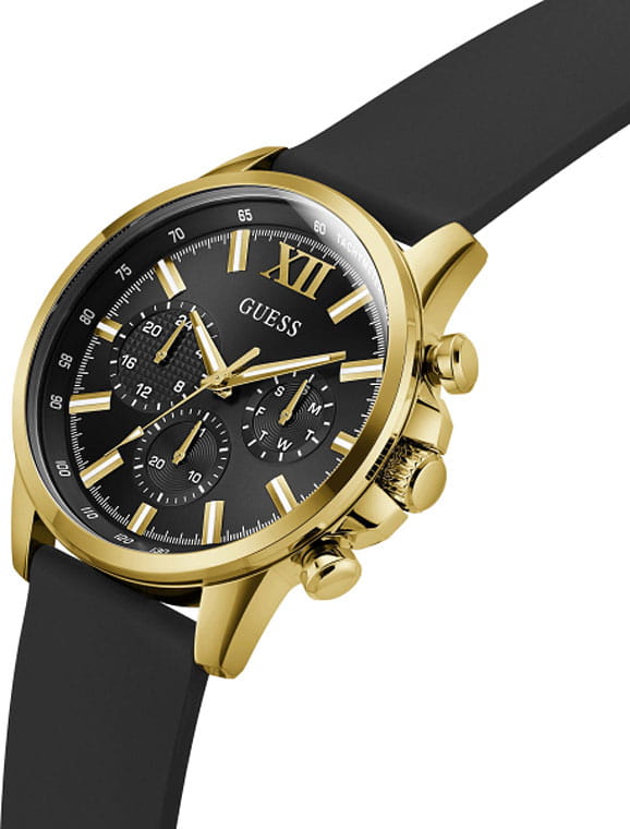 Стильные и функциональные часы Guess GW0913G2 оснащены кварцевым механизмом, что обеспечивает точность и надежность в использовании. Корпус выполнен из прочной стали с золотистым PVD-покрытиемPVDУльтратонкое покрытие наносится в технике вакуумного напыления, сочетает в себе нитрид титана особой прочности со слоем золота или оксида хрома. Несёт в себе декоративную или защитную функцию., придающей изделиям утонченный и современный вид. Циферблат украшен метками в виде штрихов и римской цифрой XII, обеспечивающими легкое считывание времени. Время отображается в двух форматах — 12-ти и 24-х часовом, что удобно для тех, кто привык к разным системам времени. Дополнительные циферблаты показывают дату и день недели, что позволяет всегда быть в курсе текущей даты без необходимости использования других устройств. Часы также оснащены тахиметромТахиметрРазмеченная шкала, располагается на ободке или безеле часов. Тахиметр позволяет рассчитать скорость на определённом участке пути, расстояние измеряется в километрах или милях., что добавляет им функциональности и может быть полезно для измерения скорости. Люминесцентное покрытиеЛюминесцентное покрытиеПозволяет считывать показания времени в темноте. Производители наносят на стрелки, часовые индексы, безель или поверхность циферблата светонакопительный состав, дающий холодное свечение. на стрелках и метках обеспечивает отличную видимость в темноте. Минеральное стеклоМинеральное стеклоМинеральное стекло представляет собой искусственно выращенный минерал кварца. Такое стекло отличается особой устойчивостью к повреждениям и царапинам. Уступает по некоторым качествам сапфировому стеклу. защищает циферблат от царапин и повреждений, а водозащита 50WR позволяет не волноваться о случайных контактах с водой, например, во время дождя. Силиконовый черный ремешок с классической застежкой обеспечивает надежную фиксацию часов на руке и комфорт в ношении. Рифленая заводная головка с защитой добавляет изысканности и одновременно защищает механизм от повреждений. Эти часы идеально подойдут для тех, кто ценит стиль, функциональность и качество в одном аксессуаре.