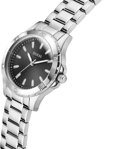 Элегантные женские наручные часы Guess Sport Mist GW0948L1 сочетают в себе стиль и функциональность. Эти часы оснащены точным кварцевым механизмом, что гарантирует надежность и долговечность. Корпус часов выполнен из прочной нержавеющей стали диаметром 35 мм. БезельБезельВнешний ободок, закрепляющий стекло. В спортивных часах так называется поворотное кольцо с делениями на циферблате, выполняет роль таймера – замеряет отрезки времени на шкале. Неподвижный безель – элемент декора. Однонаправленно вращающийся безель на дайверских часах позволяет фиксировать моменты погружения и выныривания на поверхность. украшен изысканными кристаллами, придающими им роскошный вид. Черный циферблат добавляет изделию утонченности и особого шарма. Часы оснащены стальным браслетом с раскладной застежкойРаскладная застёжкаТакой тип застёжки используется только на браслетах из металла. Она никогда не раскрывается полностью, происходит разделение на 2 и более частей. Раскладывающая застёжка снизит вероятность потери часов к минимуму., который обеспечивает комфортное прилегание к запястью и надежную фиксацию. Люминесцентное покрытиеЛюминесцентное покрытиеПозволяет считывать показания времени в темноте. Производители наносят на стрелки, часовые индексы, безель или поверхность циферблата светонакопительный состав, дающий холодное свечение. на стрелках обеспечивает отличную видимость в темноте. Минеральное стеклоМинеральное стеклоМинеральное стекло представляет собой искусственно выращенный минерал кварца. Такое стекло отличается особой устойчивостью к повреждениям и царапинам. Уступает по некоторым качествам сапфировому стеклу. защищает циферблат от царапин и повреждений, сохраняя его безупречный вид. Водозащита 50WR гарантирует защиту от случайных брызг и дождя, что делает эти часы практичным аксессуаром для повседневной жизни.