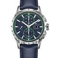 Мужские швейцарские наручные часы-хронографХронографФункция позволяет измерять отрезки времени с особой точностью: часы, минуты, секунды. Верным признаком хронографа является наличие на циферблате 3 дополнительных окошек-счётчиков. Hamilton Broadway Day Date Auto Chrono H43516641 с надёжным кварцевым механизмом. Корпус часов изготовлен из нержавеющей стали. Кожаный ремешок на стандартной застёжке. Сапфировое стеклоСапфировое стеклоПрочный и надёжный материал из кристалла сапфира синтетического происхождения, характеризующийся особой твёрдостью и устойчивостью к царапинам и повреждениям. устойчивое к мелким механическим повреждениям. Стрелки и метки с люминесцентным покрытиемЛюминесцентное покрытиеПозволяет считывать показания времени в темноте. Производители наносят на стрелки, часовые индексы, безель или поверхность циферблата светонакопительный состав, дающий холодное свечение.. Окошки дня недели и даты находятся в положении 3 часа. Класс водозащиты: 50 метров, позволит защитить корпус от случайных брызг или капель дождя. БезельБезельВнешний ободок, закрепляющий стекло. В спортивных часах так называется поворотное кольцо с делениями на циферблате, выполняет роль таймера – замеряет отрезки времени на шкале. Неподвижный безель – элемент декора. Однонаправленно вращающийся безель на дайверских часах позволяет фиксировать моменты погружения и выныривания на поверхность. со шкалой тахиметраТахиметрРазмеченная шкала, располагается на ободке или безеле часов. Тахиметр позволяет рассчитать скорость на определённом участке пути, расстояние измеряется в километрах или милях..