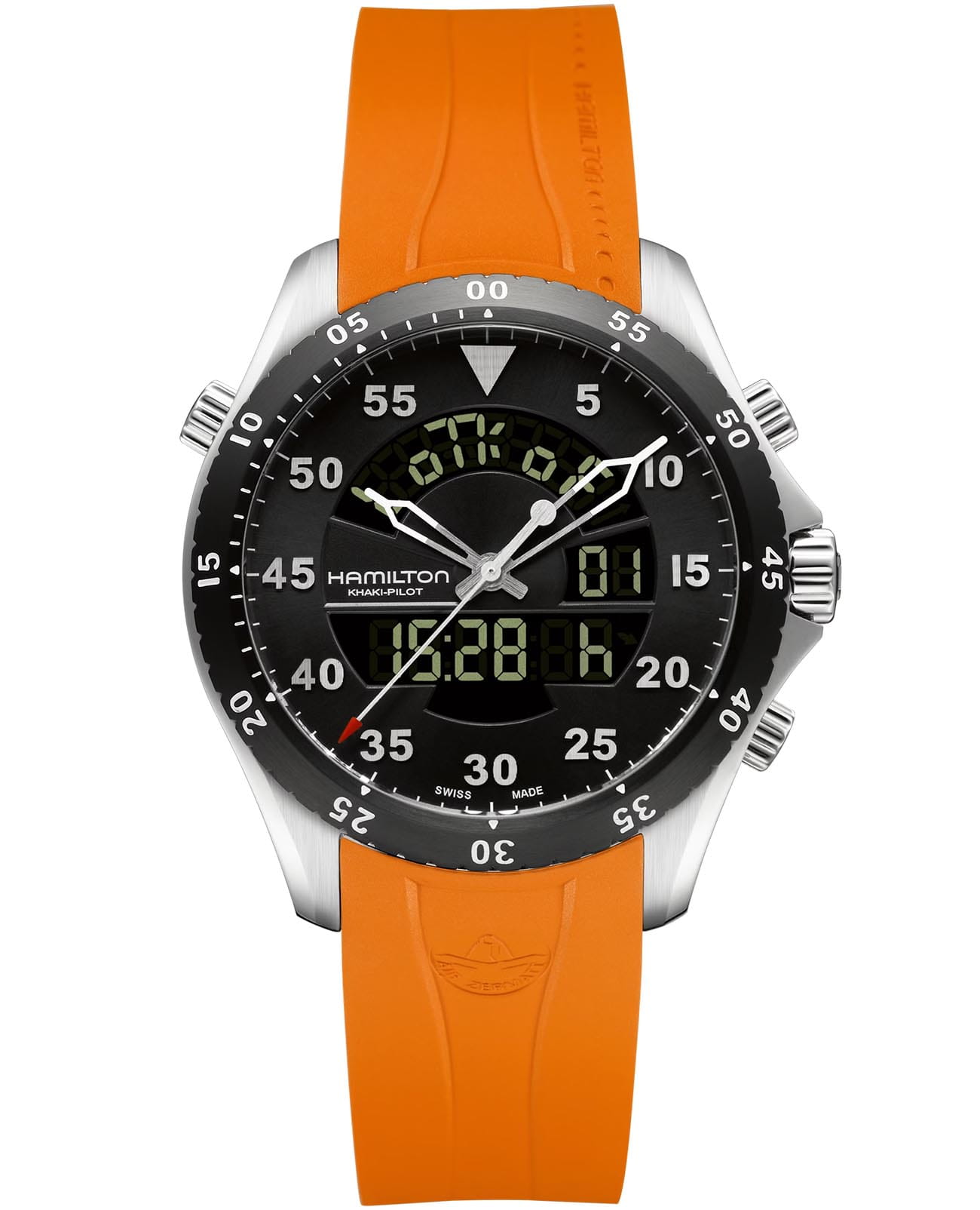 Цифровые и аналоговые дисплеи достигают новых высот благодаря Hamilton Khaki Aviation Flight Timer Quartz, сложным многофункциональным авиационным часам, которые включают в себя специальный бортовой журнал пилота для записи подробностей до 20 полетов и для каждого из них 99 посадок. Часы обладают широким спектром практичных и динамичных функций, таких как: два цифровых часовых пояса, время UTCUTCВсемирное кординационное время, не имеющее привязки к географическому положению Гринвича, основывается на атомном отсчёте времени. Регулировка времени осуществляется более точно, чем устаревшее GMT.