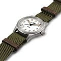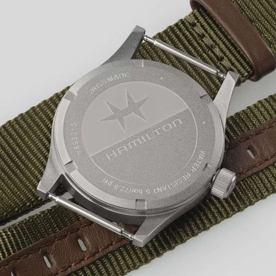 Hamilton Khaki Field Quartz H69301910 — практичные и надёжные часы в духе военной классики, идеально подходящие для повседневного использования. Корпус диаметром 33 мм выполнен из матовой нержавеющей стали, обеспечивая прочность и неброский утилитарный стиль. Циферблат оснащён крупными арабскими цифрами и стрелками с люминесцентным покрытиемЛюминесцентное покрытиеПозволяет считывать показания времени в темноте. Производители наносят на стрелки, часовые индексы, безель или поверхность циферблата светонакопительный состав, дающий холодное свечение., что гарантирует отличную читаемость даже в темноте. Защиту циферблата обеспечивает сапфировое стеклоСапфировое стеклоПрочный и надёжный материал из кристалла сапфира синтетического происхождения, характеризующийся особой твёрдостью и устойчивостью к царапинам и повреждениям., устойчивое к царапинам. Внутри установлен швейцарский кварцевый механизм ETA F05.105 mh2, обеспечивающий высокую точность и стабильность хода. Модель укомплектована тканевым ремешком с кожаной подкладкой, а классическая застёжка-пряжка гарантирует удобную и надёжную посадку. Водонепроницаемость 50 метров делает часы подходящими для повседневного ношения и защищает от мелких брызг.