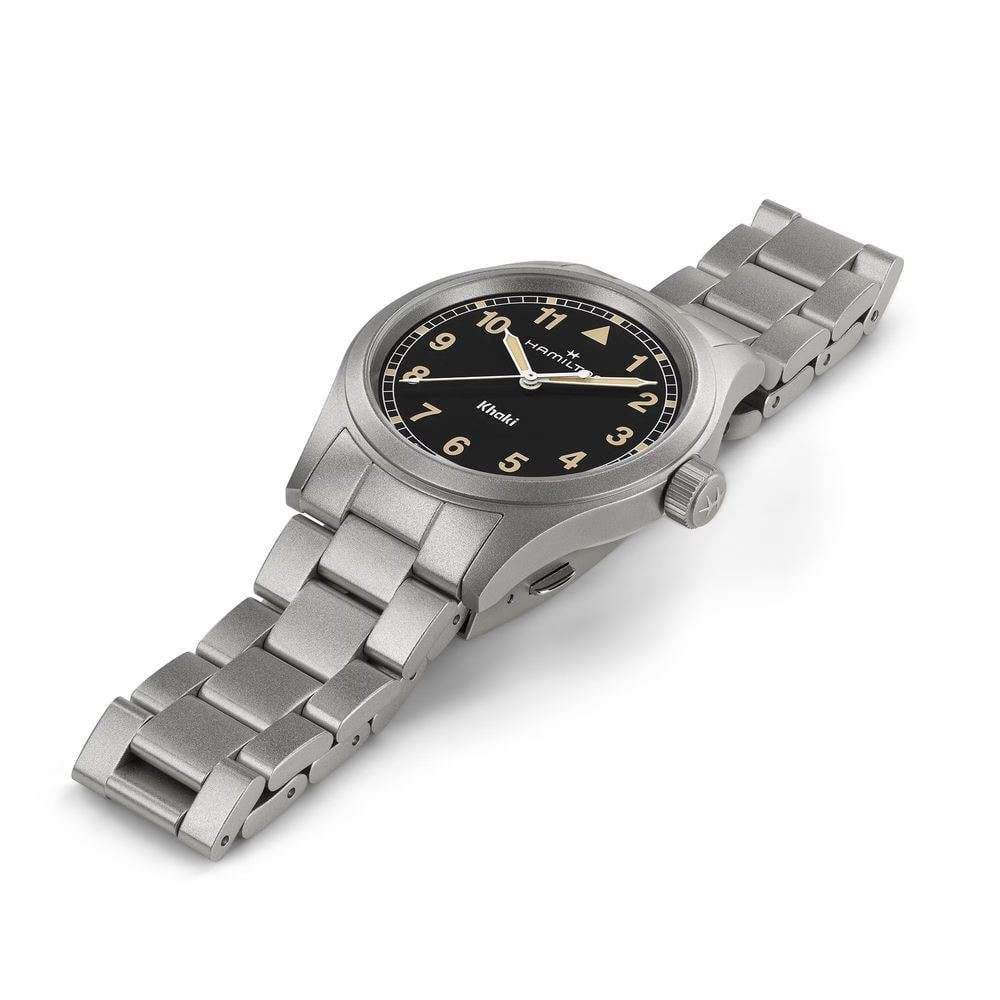 Hamilton Khaki Field Quartz H69401131 — компактные и универсальные часы в классическом военном стиле, с акцентом на надёжность и практичность. Корпус диаметром 38 мм выполнен из нержавеющей стали с сатинированной поверхностью. Он лёгкий, удобный и идеально подходит для запястий любого размера. Циферблат защищён сапфировым стекломСапфировое стеклоПрочный и надёжный материал из кристалла сапфира синтетического происхождения, характеризующийся особой твёрдостью и устойчивостью к царапинам и повреждениям. с антибликовым покрытиемАнтибликовое покрытиеСлой оксида металла в 0,13-0,3 микрон, благодаря которому стекло часов не бликует и не отражает свет. Антибликовое покрытие уменьшает отражение света в 10 раз, обеспечивая отличную читаемость показателей циферблата., устойчивым к царапинам и бликам. Циферблат оформлен в классическом армейском стиле: крупные арабские цифры, 24-часовая шкала по внутреннему кругу, стрелки и метки с люминесцентным покрытиемЛюминесцентное покрытиеПозволяет считывать показания времени в темноте. Производители наносят на стрелки, часовые индексы, безель или поверхность циферблата светонакопительный состав, дающий холодное свечение. для удобного считывания в темноте. Внутри установлен швейцарский кварцевый калибр ETA F05.105mh2 с функцией EOL-индикацииEOLПредставляет собой систему, уведомляющую владельца часов о необходимости замены элемента питания. За 2 недели до полного разряда батарейки секундная стрелка перестаёт ходить чётко и начинает перепрыгивать на 3-4 деления. — предупреждением о скором разряде батареи. Модель укомплектована браслетом из нержавеющей стали с раскладной застёжкойРаскладная застёжкаТакой тип застёжки используется только на браслетах из металла. Она никогда не раскрывается полностью, происходит разделение на 2 и более частей. Раскладывающая застёжка снизит вероятность потери часов к минимуму., обеспечивающей надёжную посадку. Водонепроницаемость 50 метров делает часы устойчивыми к брызгам и дождю, идеально подходящими для повседневного ношения. Khaki Field Quartz — надёжный выбор для тех, кто ценит простоту, точность и долговечность.