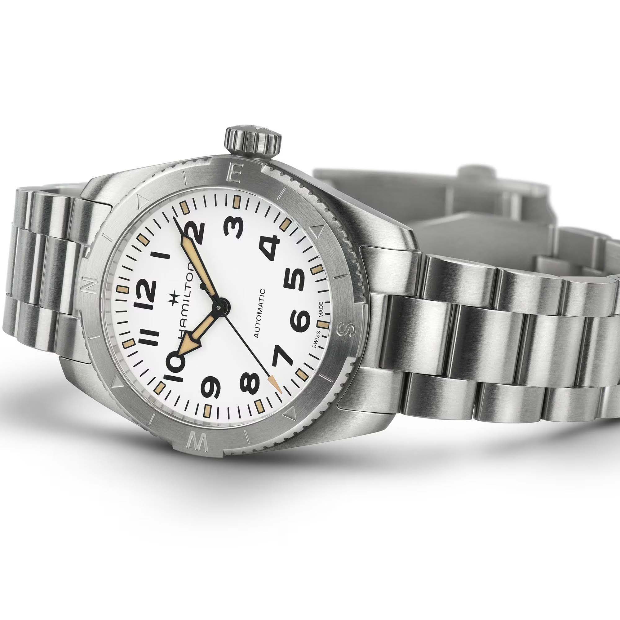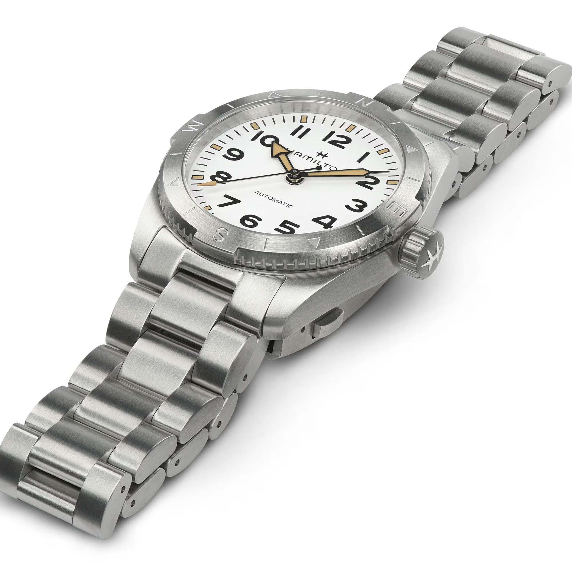 Мужские наручные часы Hamilton Khaki Field Expedition Auto H70225110 с автоматическим механизмом. Корпус часов изготовлен из нержавеющей стали. Стальной браслет на раскладной застёжкеРаскладная застёжкаТакой тип застёжки используется только на браслетах из металла. Она никогда не раскрывается полностью, происходит разделение на 2 и более частей. Раскладывающая застёжка снизит вероятность потери часов к минимуму.. Сапфировое стеклоСапфировое стеклоПрочный и надёжный материал из кристалла сапфира синтетического происхождения, характеризующийся особой твёрдостью и устойчивостью к царапинам и повреждениям. с антибликовым покрытием. Стрелки и метки с люминесцентным покрытиемЛюминесцентное покрытиеПозволяет считывать показания времени в темноте. Производители наносят на стрелки, часовые индексы, безель или поверхность циферблата светонакопительный состав, дающий холодное свечение.. Уровень влагозащиты: 100 метров, позволит плавать, нырять и заниматься другими водными видами спорта.