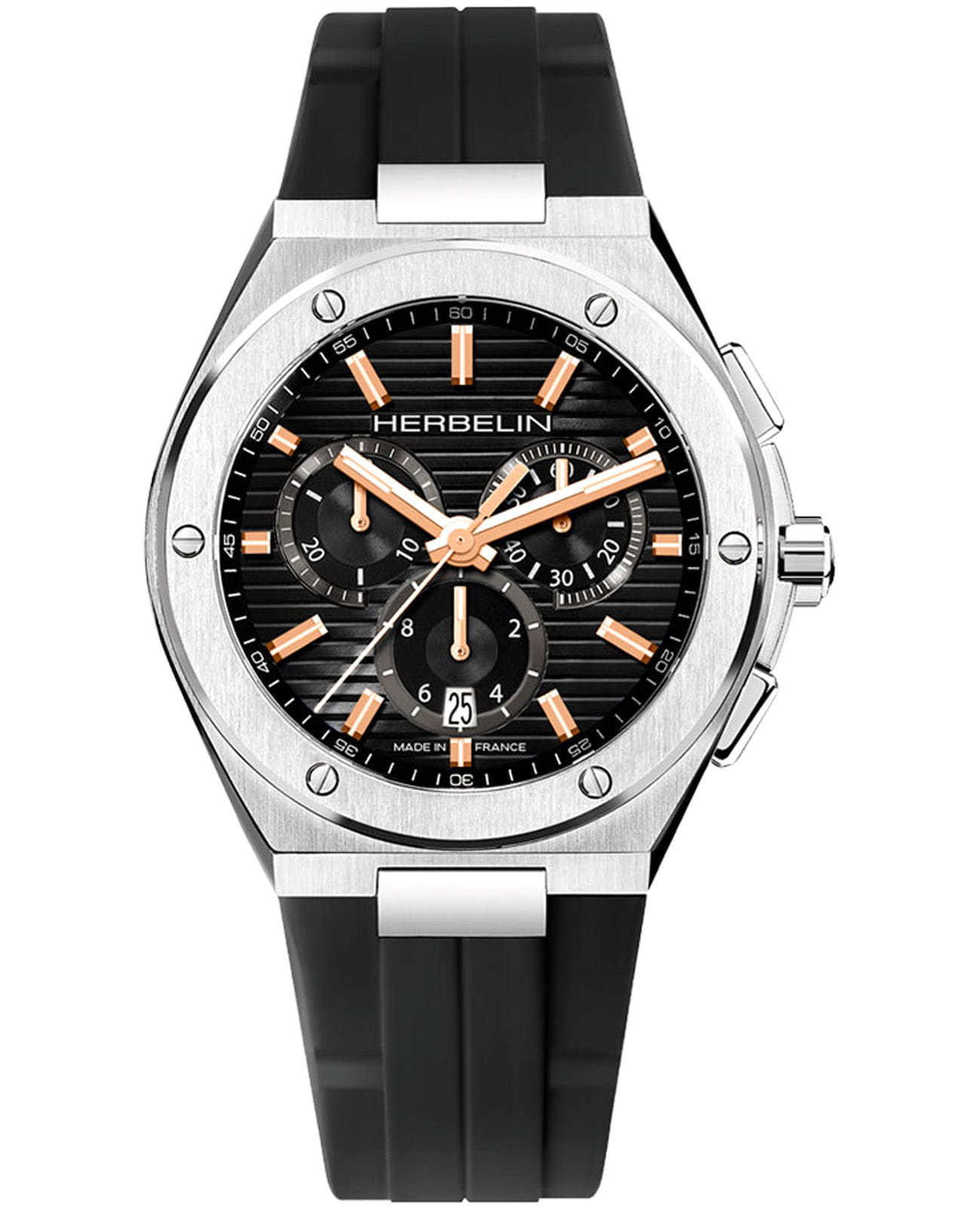 Мужские кварцевые наручные часы-хронографХронографФункция позволяет измерять отрезки времени с особой точностью: часы, минуты, секунды. Верным признаком хронографа является наличие на циферблате 3 дополнительных окошек-счётчиков. Herbelin Cap Camarat 37645A14TR – отражающий идеальное сочетание современного дизайна, надёжности и функциональности. Элегантный облик станет превосходным завершением образа, наделив его индивидуальным характером. Корпус из нержавеющей стали серебристого цвета, диаметром 42 мм, идеально сбалансирован и элегантен. Сапфировое стеклоСапфировое стеклоПрочный и надёжный материал из кристалла сапфира синтетического происхождения, характеризующийся особой твёрдостью и устойчивостью к царапинам и повреждениям. защищает циферблат от царапин и устойчивое к механическим повреждениям. БезельБезельВнешний ободок, закрепляющий стекло. В спортивных часах так называется поворотное кольцо с делениями на циферблате, выполняет роль таймера – замеряет отрезки времени на шкале. Неподвижный безель – элемент декора. Однонаправленно вращающийся безель на дайверских часах позволяет фиксировать моменты погружения и выныривания на поверхность. украшен винтами, заводная головка с защитой. Окошко даты находится в положении 6 часов. Стрелки и метки с люминесцентным покрытиемЛюминесцентное покрытиеПозволяет считывать показания времени в темноте. Производители наносят на стрелки, часовые индексы, безель или поверхность циферблата светонакопительный состав, дающий холодное свечение.. Каучуковый ремешок на стандартной застежке обеспечивает комфортное ношение. Водозащита 100 метров позволит плавать, нырять и заниматься другими водными видами спорта. Эта модель – отличный выбор для тех, кто ищет сочетание стиля, качества и функциональности. Часы станут не только полезным аксессуаром, но и выразительным элементом вашего имиджа.