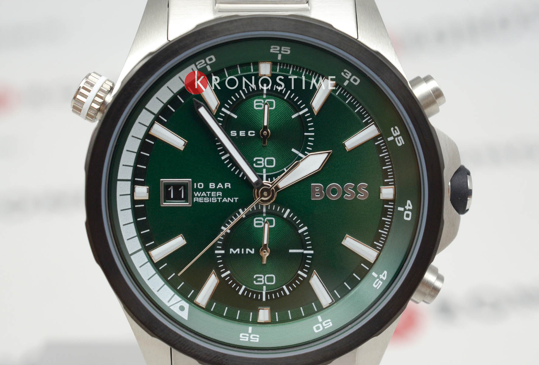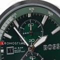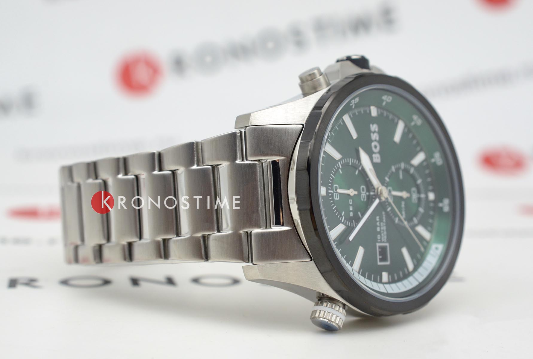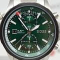 Мужские часы Hugo Boss Globetrotter HB 1513930 представлены в круглом 46-мм корпусе из нержавеющей стали с IP-покрытиемIP-покрытиеМетод ионного напыления. Демонстрирует повышенную устойчивость к истиранию, окислению и химическим веществам. Под воздействием высокого давления и температуры около 1500°C молекулы металла надёжно соединяются с частицами корпуса часов.. Оснащены кварцевым механизмом с функциями хронографаХронографФункция позволяет измерять отрезки времени с особой точностью: часы, минуты, секунды. Верным признаком хронографа является наличие на циферблате 3 дополнительных окошек-счётчиков. и секундомеромСекундомерСекундоме́р — прибор, способный измерять интервалы времени с точностью до долей секунды.. Зеленый циферблат защищен устойчивым к царапинам минеральным стекломМинеральное стеклоМинеральное стекло представляет собой искусственно выращенный минерал кварца. Такое стекло отличается особой устойчивостью к повреждениям и царапинам. Уступает по некоторым качествам сапфировому стеклу.. Стальной браслет серебристого цвета дополнен раскладной застёжкойРаскладная застёжкаТакой тип застёжки используется только на браслетах из металла. Она никогда не раскрывается полностью, происходит разделение на 2 и более частей. Раскладывающая застёжка снизит вероятность потери часов к минимуму., а стрелки покрыты люминесцентным составомЛюминесцентное покрытиеПозволяет считывать показания времени в темноте. Производители наносят на стрелки, часовые индексы, безель или поверхность циферблата светонакопительный состав, дающий холодное свечение. для видимости в темноте. Водонепроницаемость 100 метров (10 ATM) позволяет использовать часы для плавания.
